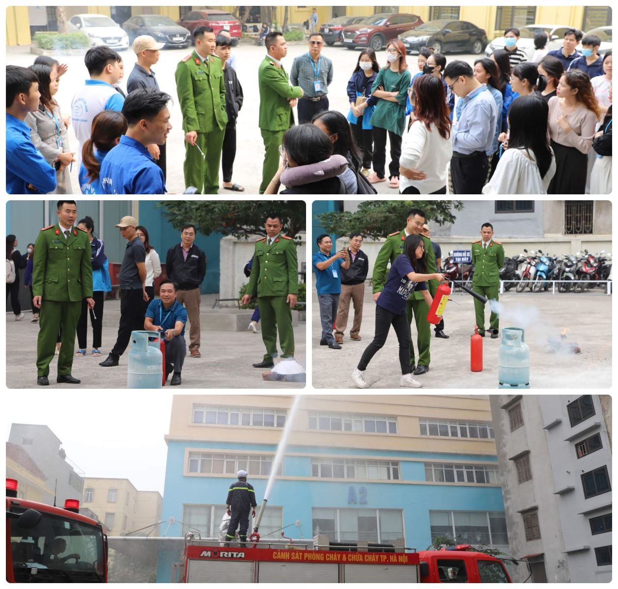 Sau khi được tiếp nhận các kiến thức về lý thuyết, các học viên được hướng dẫn thực hành thao tác sử dụng bình chữa cháy xách tay: Bình bột MFZ4, bình khí CO2-MT3 và sử dụng thành thạo các phương tiện PCCC được trang bị tại cơ sở và tham gia diễn tập phương án chữa cháy và cứu nạn, cứu hộ trực tiếp tại Học viện.