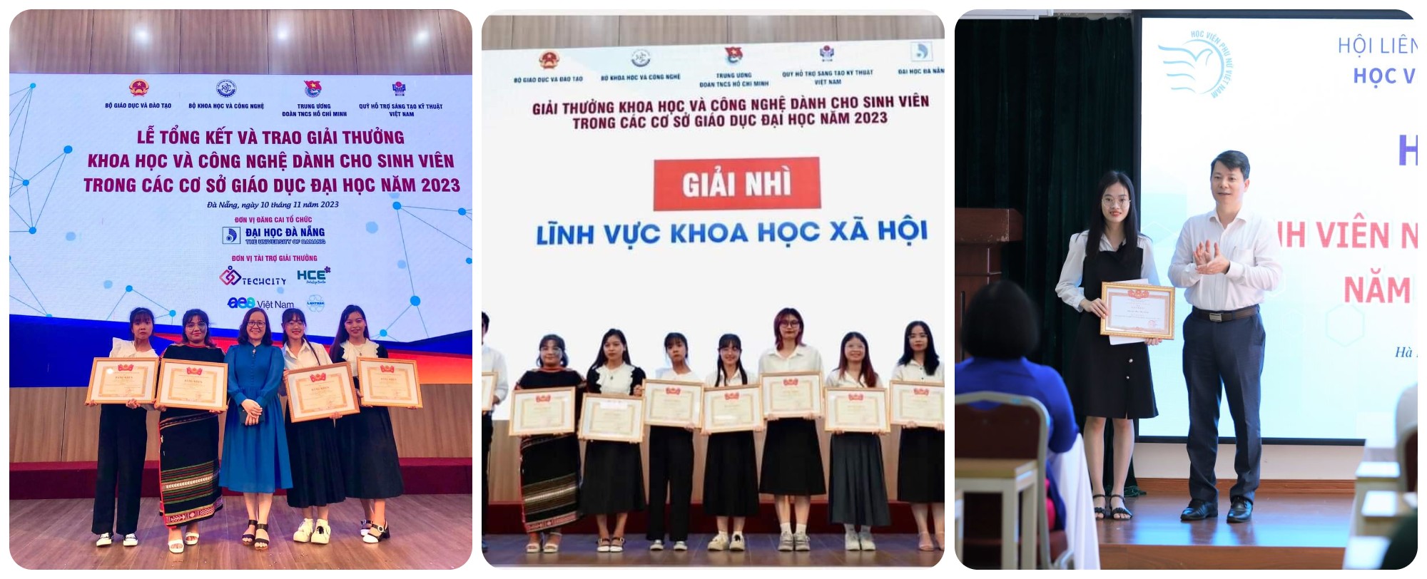 Từ trái qua phải: 2 ảnh đầu – Giải Nhì lĩnh vực Khoa học Xã hội- Nhóm sinh viên K8 Giới & Phát triển và TS. Trương Thúy Hằng (GV hướng dẫn) trong lễ trao giải “Giải thưởng Khoa học và Công nghệ dành cho Sinh viên trong các cơ sở giáo dục đại học Toàn quốc năm 2023”;Ảnh 3: PGS.TS. Trần Quang Tiến – Giám đốc Học viện trao giải Nhất sinh viên NCKH cấp Học viện cho SV Mai Thị Lành – K8 Giới & Phát triển.