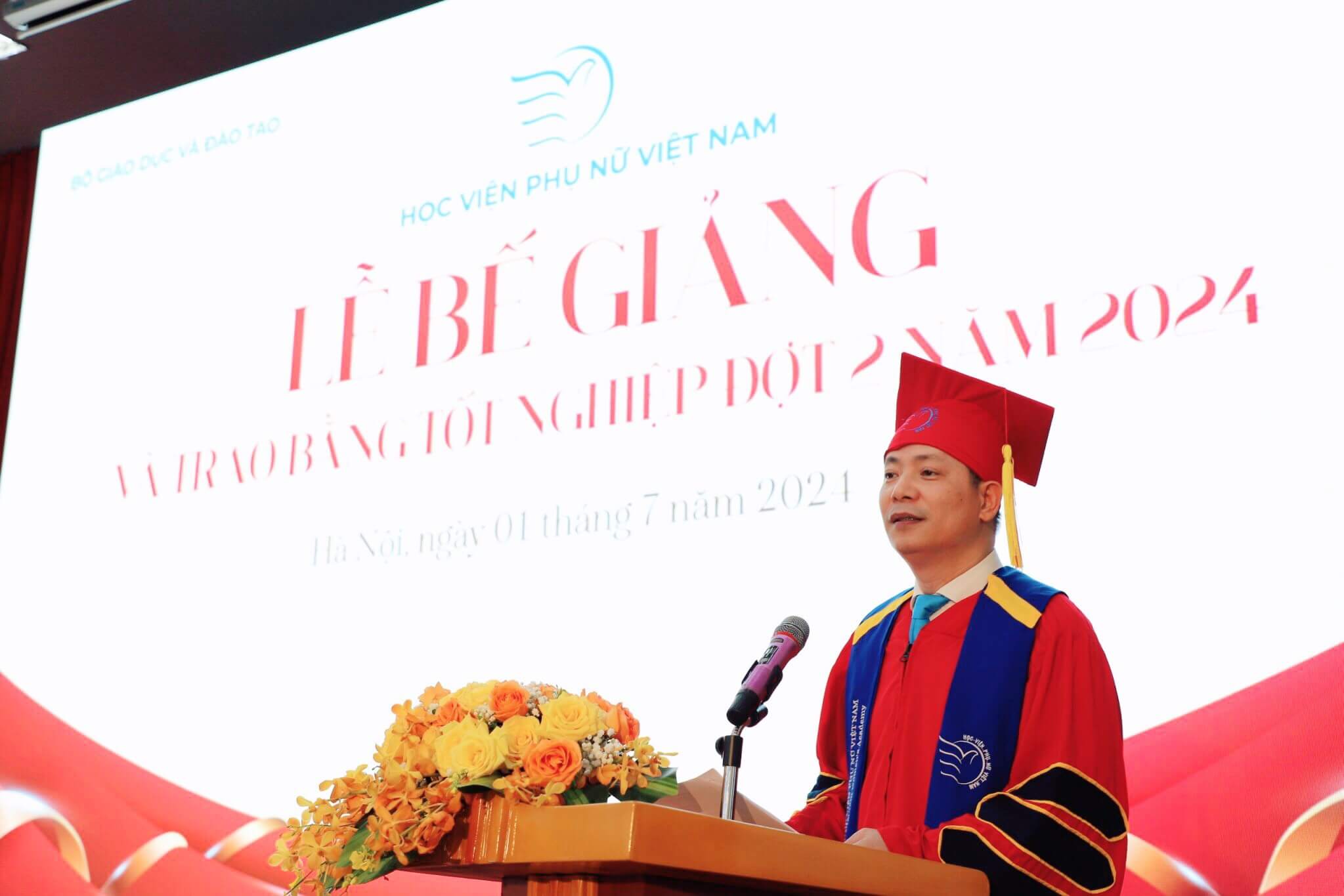 Hôm nay, Học viện Phụ nữ Việt Nam long trọng tổ chức Lễ trao bằng tốt nghiệp đợt 2 năm 2024 cho 27 học viên cao học và 182 sinh viên hệ đại học chính quy và liên thông. Lời đầu tiên cho phép tôi thay mặt Đảng ủy, BGĐ Học viện, xin nồng nhiệt chào mừng các quý vị đại biểu, các bậc phụ huynh và đặc biệt xin chúc mừng các học viên cao học và sinh viên đã hoàn thành xuất sắc nhiệm vụ học tập tại Học viện Phụ nữ Việt Nam.