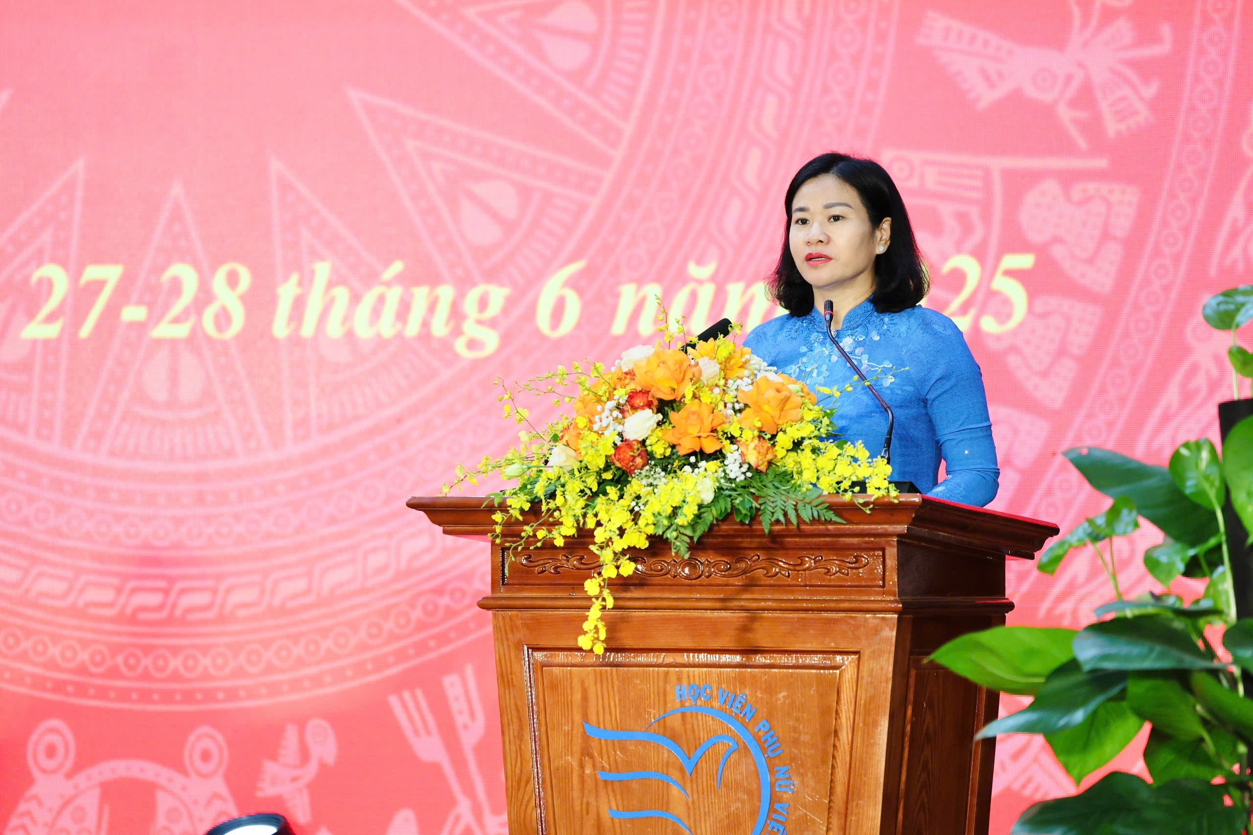 Phát biểu chỉ đạo tại Đại hội, đồng chí Nguyễn Thị Tuyến – Ủy viên BCH Trung ương Đảng, Chủ tịch Hội LHPN Việt Nam ghi nhận những kết quả toàn diện của Đảng bộ Học viện trong nhiệm kỳ 2020–2025, đặc biệt là việc được nâng cấp thành Đảng bộ cơ sở với hệ thống tổ chức phát triển, công tác xây dựng Đảng, bồi dưỡng, đào tạo, nghiên cứu và phục vụ cộng đồng đạt nhiều thành tựu nổi bật. Đồng chí nhấn mạnh: Nhiệm kỳ tới, Đảng bộ cần tiếp tục quán triệt sâu sắc các Nghị quyết Trung ương Đảng, tăng cường giáo dục chính trị tư tưởng, đẩy mạnh chuyển đổi số, đổi mới sáng tạo và nâng cao chất lượng đào tạo. Học viện cần phấn đấu trở thành cơ sở nghiên cứu hàng đầu về phụ nữ và bình đẳng giới, xây dựng đội ngũ cán bộ có trình độ cao, môi trường học thuật hiện đại, thân thiện và hội nhập. Bên cạnh đó, tiếp tục phát huy vai trò của sinh viên – đảng viên, chú trọng phát triển nguồn cán bộ trẻ chất lượng cao, đóng góp thiết thực vào sự phát triển của Hội LHPN Việt Nam và của đất nước.