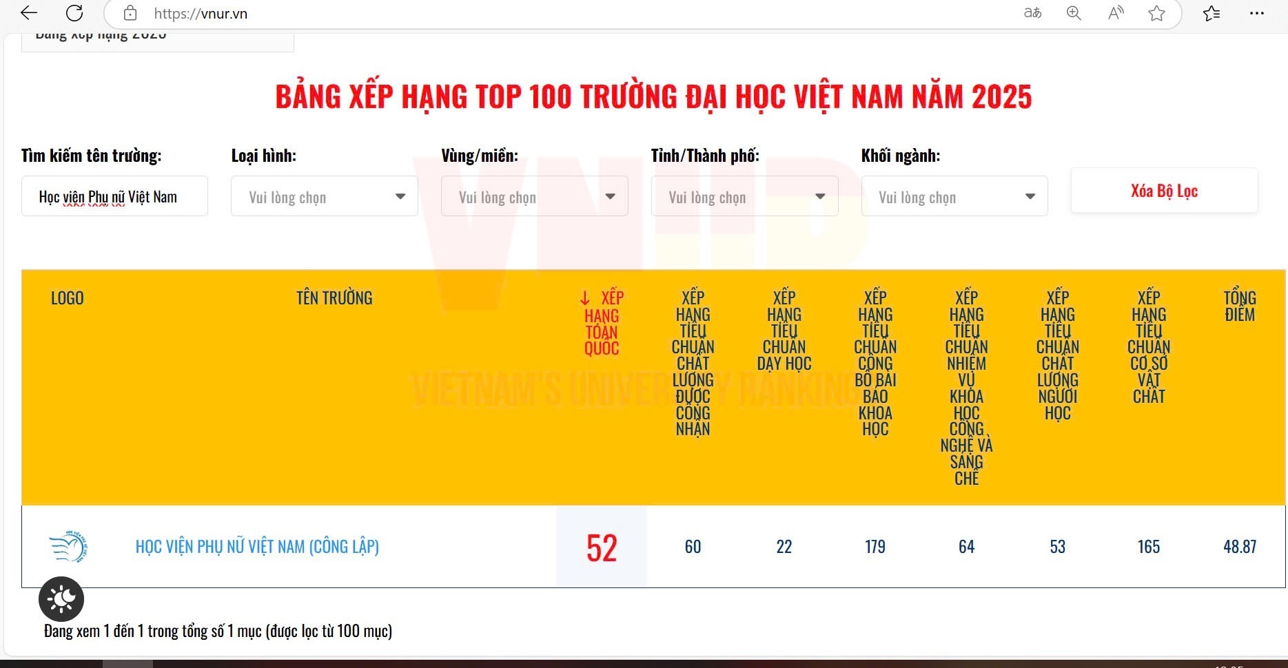 Học viện Phụ nữ Việt Nam một lần nữa củng cố vị thế, khẳng định uy tín ở vị trí top giữa tại bảng xếp hạng 100 trường đại học tốt nhất Việt Nam. Đây là cơ hội để Học viện tăng cường tầm ảnh hưởng và mạnh mẽ hiện thực hóa mục tiêu, tầm nhìn chiến lược trong giai đoạn tới. Với triết lý Giáo dục Toàn diện, Chất lượng, Bình đẳng, Học viện Phụ nữ Việt Nam sẽ không ngừng vươn lên, khẳng định uy tín, thương hiệu trong công tác đào tạo, bồi dưỡng và nghiên cứu, đóng góp những giá trị tích cực vào sự phát triển bền vững, tiến bộ của đất nước.