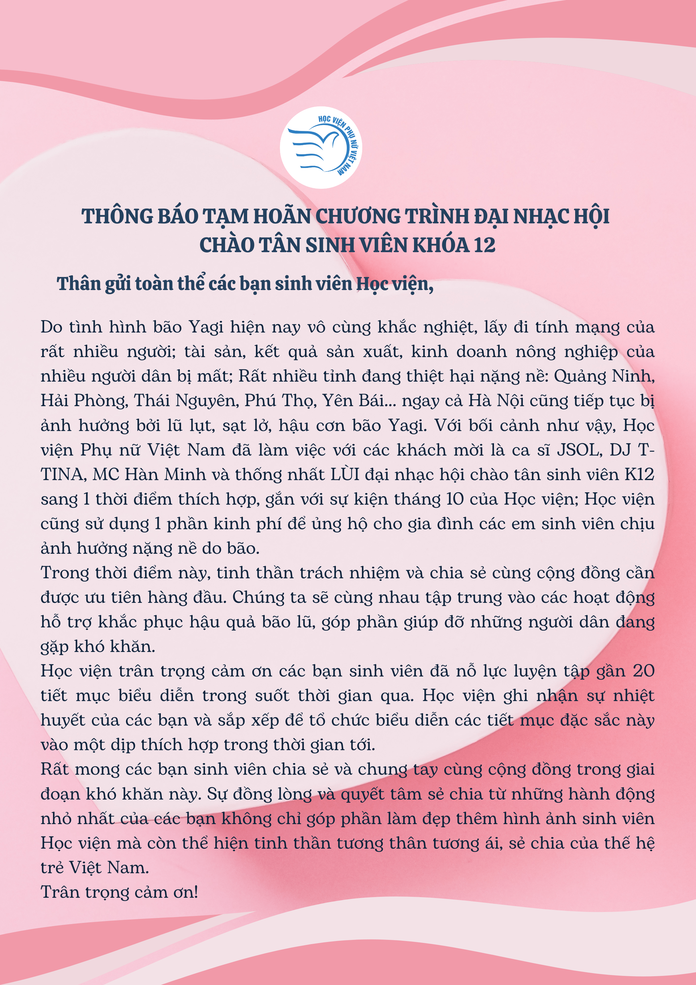 Với tinh thần trách nhiệm cộng đồng, Học viện Phụ nữ Việt Nam đã trao đổi và thống nhất cùng các nghệ sĩ khách mời, bao gồm ca sĩ JSOL, DJ T-TINA, MC Hàn Minh lùi sự kiện đại nhạc hội chào tân sinh viên K12 (dự kiến tổ chức vào tối ngày 10/9). Sự kiện sẽ được tổ chức lại vào một thời điểm thích hợp hơn, gắn với các hoạt động tháng 10 của Học viện. Đây là một quyết định đúng đắn và kịp thời, vừa thể hiện tinh thần sẻ chia với cộng đồng, vừa bảo đảm an toàn cho các bạn sinh viên và nghệ sĩ.