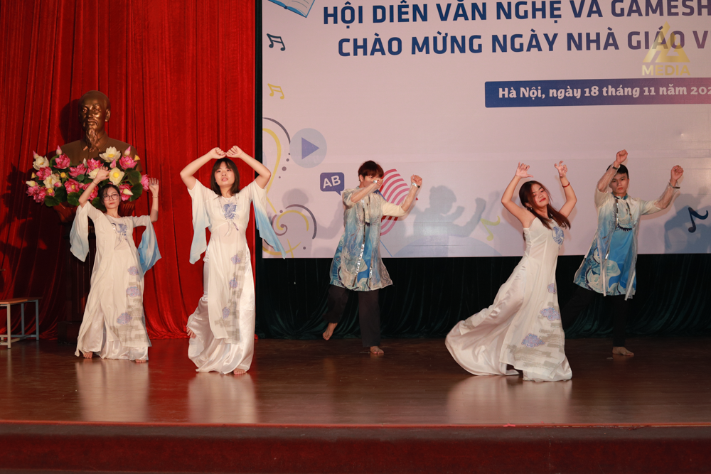 Tiết mục múa Tát Nước Đầu Đình do sinh viên ngành Luật thể hiện đã thể hiện rõ vẻ đẹp tài năng, duyên dáng của sinh viên Học viện Phụ nữ Việt Nam.