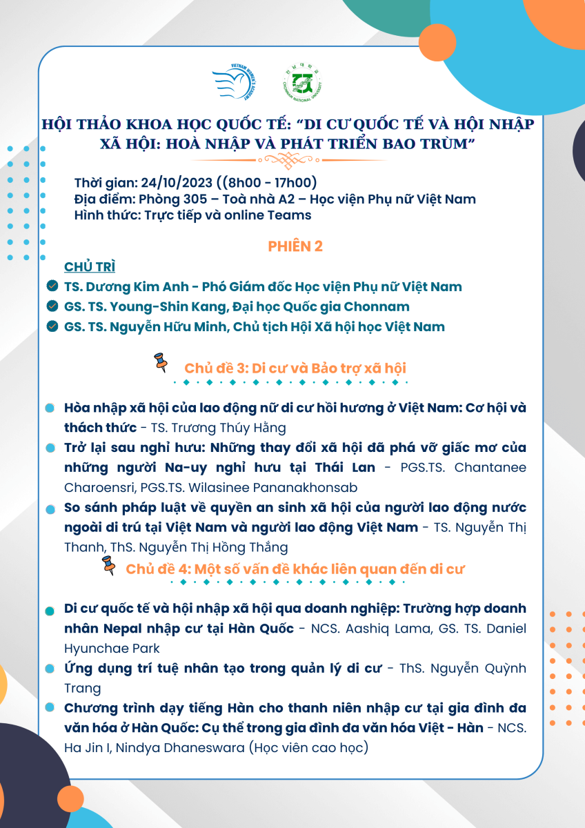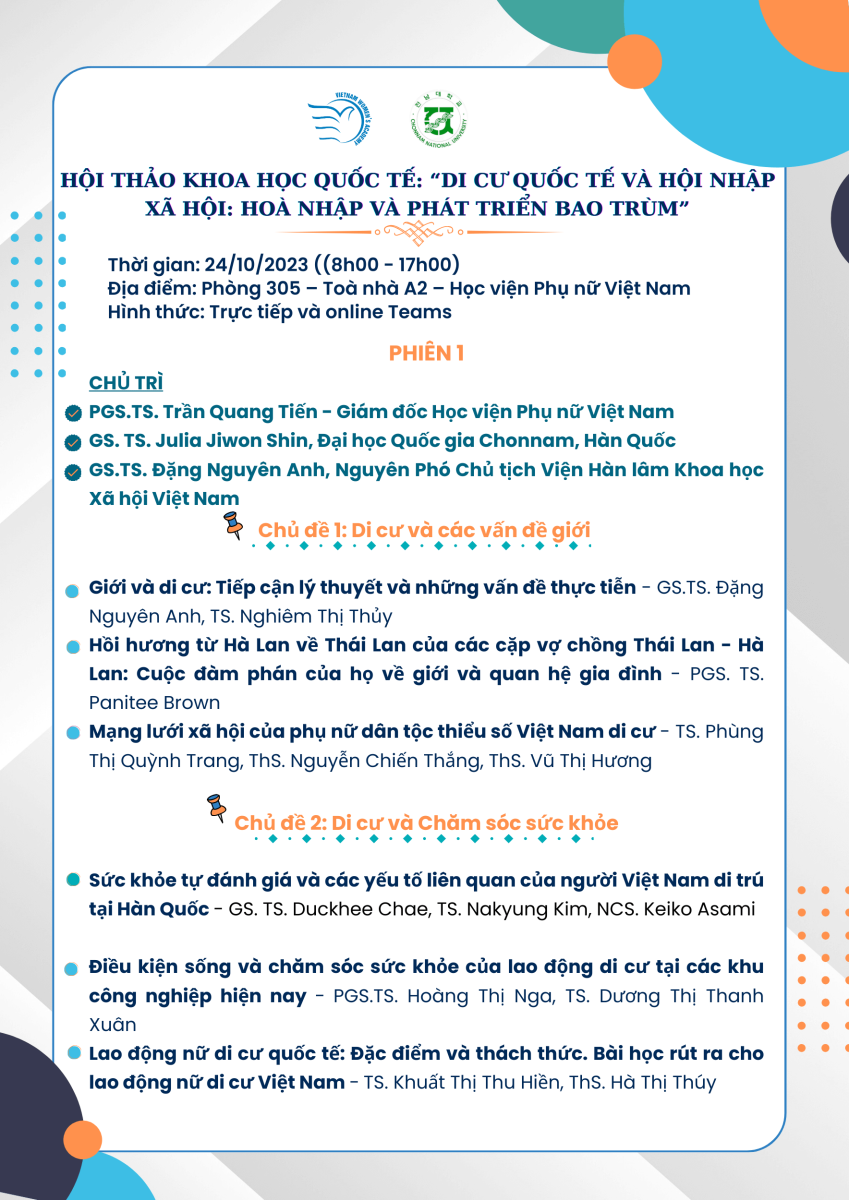 Tóm lại, vấn đề di cư có tác động phức tạp đến xã hội và đòi hỏi sự đối ứng thông qua các biện pháp chính trị, kinh tế, và xã hội để đảm bảo tích hợp, bảo vệ nhân quyền, và tối ưu hóa lợi ích cho cả người di cư và các nước tiếp nhận. Tiếp nối thành công của Hội thảo khoa học Quốc tế “Di cư và đa văn hoá: Sự thay đổi, thích ứng và các vấn đề giới” được Học viện Phụ nữ Việt Nam và Đại học Quốc gia Chonnam (Hàn Quốc) tổ chức thành công vào ngày 28/2/2019 tại Hà Nội, ngày 24/10/2023 hai đơn vị tổ chức Hội thảo khoa học Quốc tế với chủ đề: “Di cư quốc tế và Hội nhập xã hội: Hòa nhập và Phát triển bao trùm” (International Migration and Social Integration: Inclusion and Entire Development).