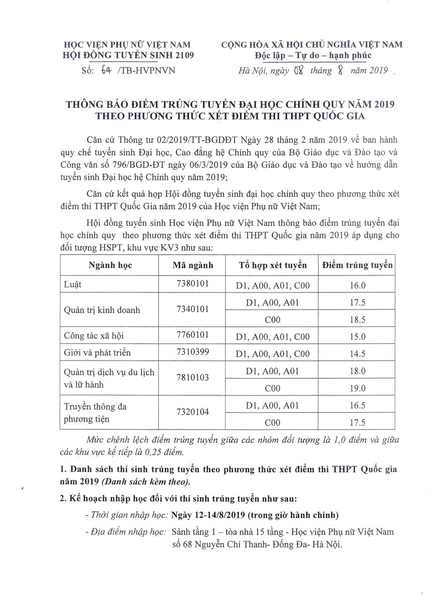Danh sách thí sinh trúng tuyển ĐH chính quy 2019 (theo hình thức xét điểm thi THPT Quốc gia)