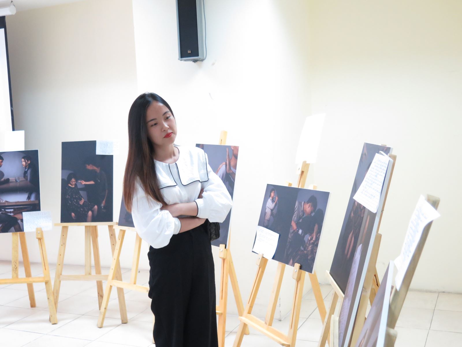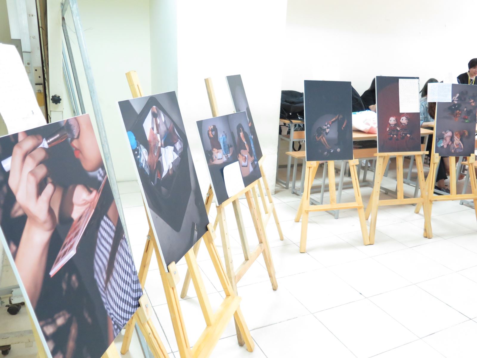 Nếu như không gian của Talkshow dành cho sự chia sẻ từ các nạn nhân bị bạo lực gia đình trên cơ sở giới về những câu chuyện thực tế thì cũng với chủ đề này, triển lãm ảnh đa màu sắc đem đến những tấm ảnh nghệ thuật phía sau tấm rèm đỏ về vấn nạn bạo lực giới. Một chủ đề nhạy cảm đã được các bạn sinh viên khai thác bằng tất cả tài năng, sự nhiệt huyết nhằm mong muốn góp phần giảm thiểu nạn bạo lực gia đình. Những tấm ảnh lấy cảm hứng từ câu chuyện có thật và được đặc tả với bố cục, ánh sáng gây xúc động cho người xem. Những lời tâm sự, những bức ảnh đầy sự rung cảm đã đem lại ấn tượng sâu sắc cho người tham dự.