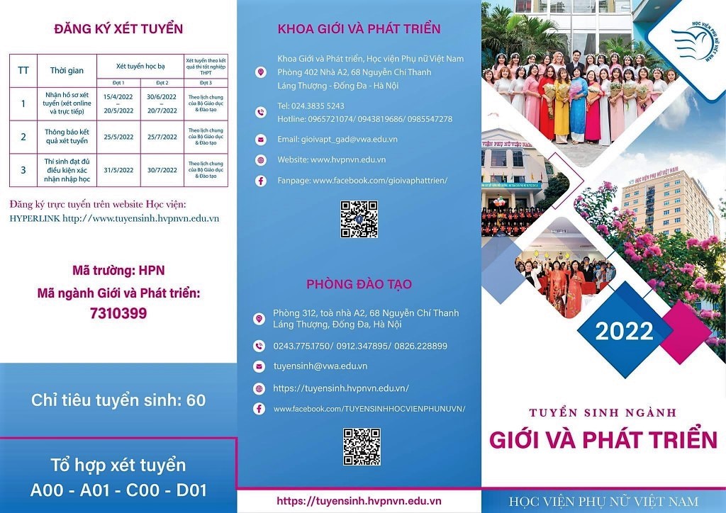 TUYỂN SINH ĐẠI HỌC NĂM 2022 – NGÀNH GIỚI VÀ PHÁT TRIỂN – 60 chỉ tiêu Mã trường: HPN; Tên ngành: Giới và Phát triển; Mã ngành: 7310399 Phương thức tuyển sinh: Xét tuyển theo học bạ (THPT); Xét tuyển thẳng; Xét tuyển theo kết quả thi THPT năm 2022 Thời gian xét học bạ đợt 1: Từ 20/6-14/7/2022 Link đăng ký xét tuyển online: https://xettuyen.hvpnvn.edu.vn/; Điện thoại: (024) 38355243; 097.734.7986. Facebook: https://www.facebook.com/gioivaphattrien/ Email: gioivapt_gad@vwa.edu.vn |