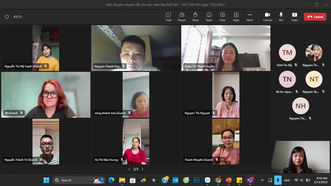 Sáng ngày 18/5/2023 chuyên gia Jill.M.Chonody đã làm việc với Khoa Công tác xã hội để trao đổi về chương trình đào tạo tiến sĩ ngành CTXH sắp mở tại Học viện Phụ nữ Việt Nam. Buổi làm việc đã thu được rất nhiều kết quả, đặc biệt là kinh nghiệm tổ chức đào tạo tiến sĩ ngành CTXH tại Mỹ.