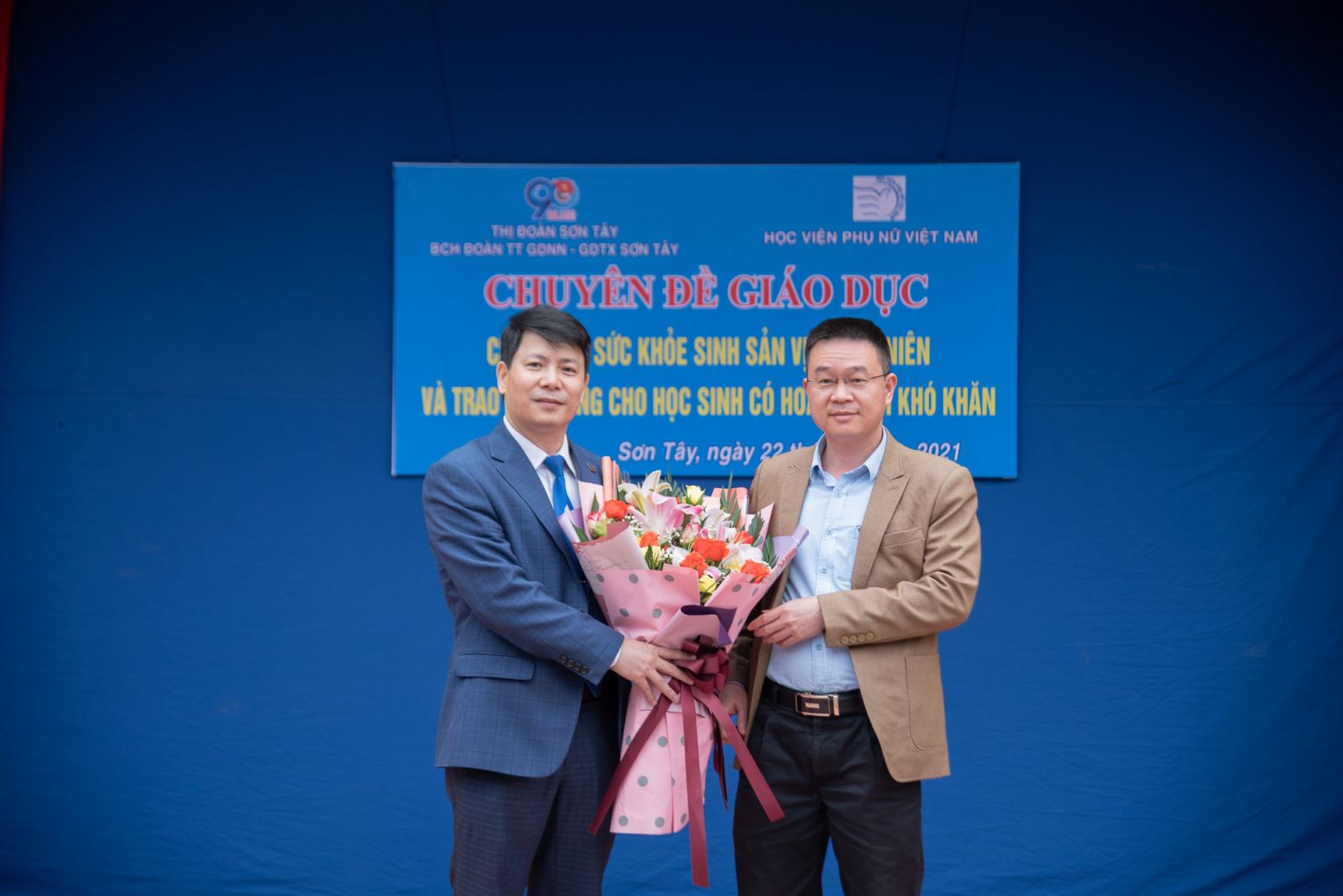 Giám đốc Trung tâm GDNN – GDTX thị xã Sơn Tây trao hoa cảm ơn đại diện Học viện Phụ nữ Việt Nam
