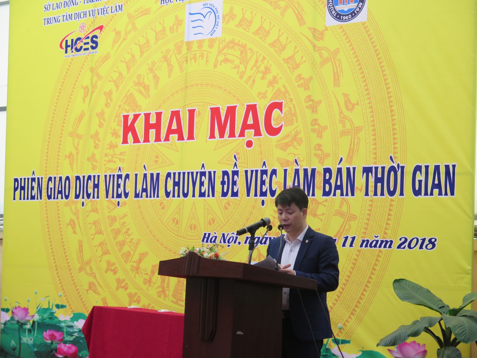 Phát biểu tại Phiên giao dịch việc làm, TS. Trần Quang Tiến khẳng định Trung tâm Dịch vụ việc làm Hà Nội và Học viện Phụ nữ đã có sự hợp tác hiệu quả trong nhiều hoạt động những năm gần đây trong đó có hoạt động đào tạo kỹ năng tìm kiếm việc làm cho sinh viên. Tham gia phiên giao dịch việc làm Bán thời gian một lần nữa, các em sinh viên được trải nghiệm thực tế tại sàn giao dịch việc làm, được thực hành kỹ năng tìm kiếm việc làm, có cơ hội tìm việc làm thêm bán thời gian và tiếp xúc phỏng vấn trực tiếp với các doanh nghiệp có nhu cầu tuyển dụng để tìm được vị trí công việc làm thêm phù hợp. Đây là một hoạt động rất thiết thực và có ý nghĩa. Thầy mong rằng các em sinh viên phát huy tính năng động, sáng tạo, những kiến thức kỹ năng mình đã tích lũy được để có những trải nghiệm hiệu quả tại sàn giao dịch việc làm.