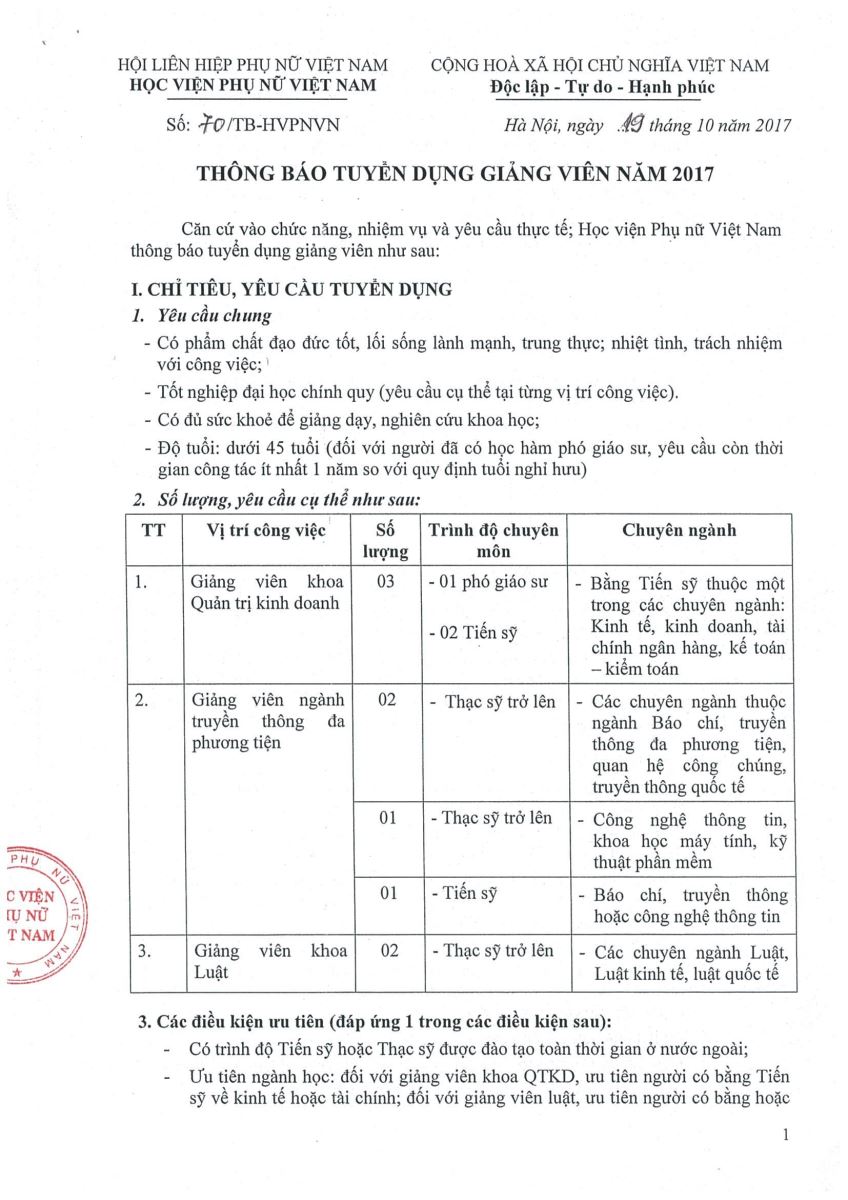 Học viện Phụ nữ Việt Nam thông báo tuyển dụng giảng viên năm 2017