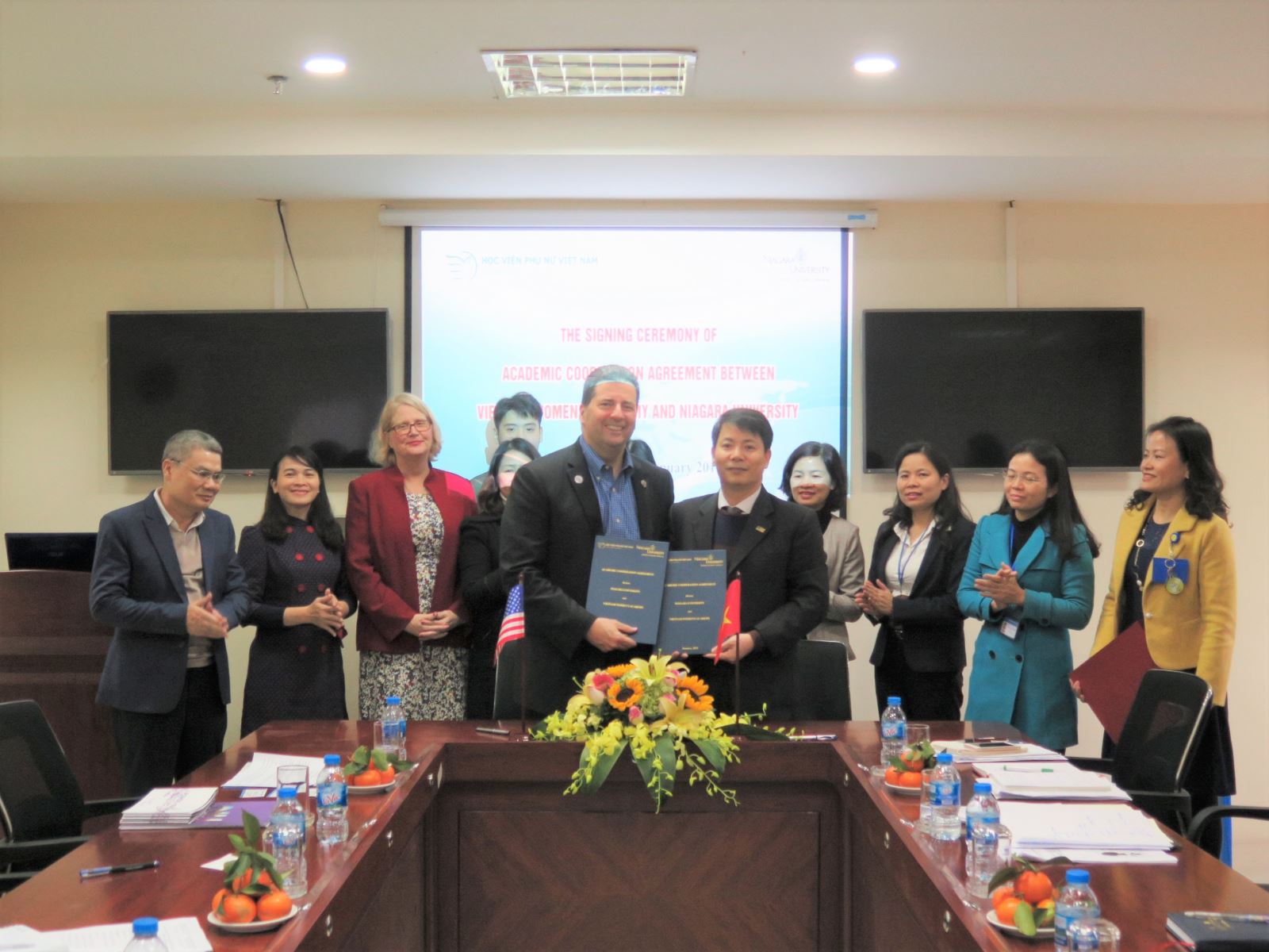 Tham dự buổi làm việc và ký kết hợp tác, về phía trường Đại học Niagara có ông James J. Maher, Hiệu trưởng và bà Deborah T. Curtis, Giám đốc điều hành, Trung tâm Brennan – Trung tâm Quan hệ Quốc tế. Về phía Học viện Phụ nữ Việt Nam có sự tham dự của TS. Trần Quang Tiến, Bí thư Đảng ủy, Giám đốc Học viện; thành viên Ban Giám đốc và đại diện lãnh đạo một số đơn vị Học viện.