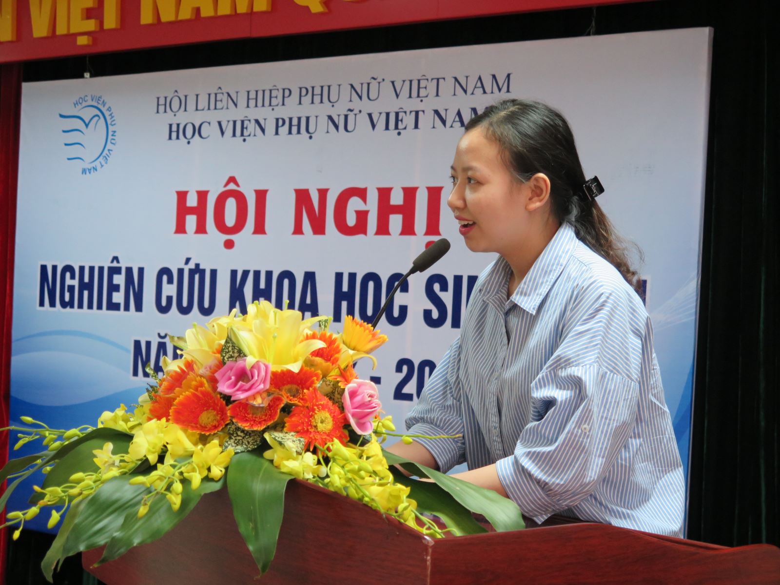 Hội nghị cũng nhận được sự chia sẻ đầy tâm huyết của ThS. Trương Thúy Hằng, Viện nghiên cứu Phụ nữ từ những trải nghiệm của một cán bộ hướng dẫn sinh viên NCKH. Bên cạnh đó, các đại biểu hội nghị còn được lắng nghe những tâm sự cảm động về quá trình thực hiện đề tài nghiên cứu của sinh viên Nguyễn Thị Doãn An, K4 Khoa Quản trị kinh doanh đạt giải Nhất NCKH sinh viên năm học 2017 – 2018 với đề tài: Những nhân tố ảnh hưởng tới việc chọn ngành học của sinh viên Học viện Phụ nữ Việt Nam.