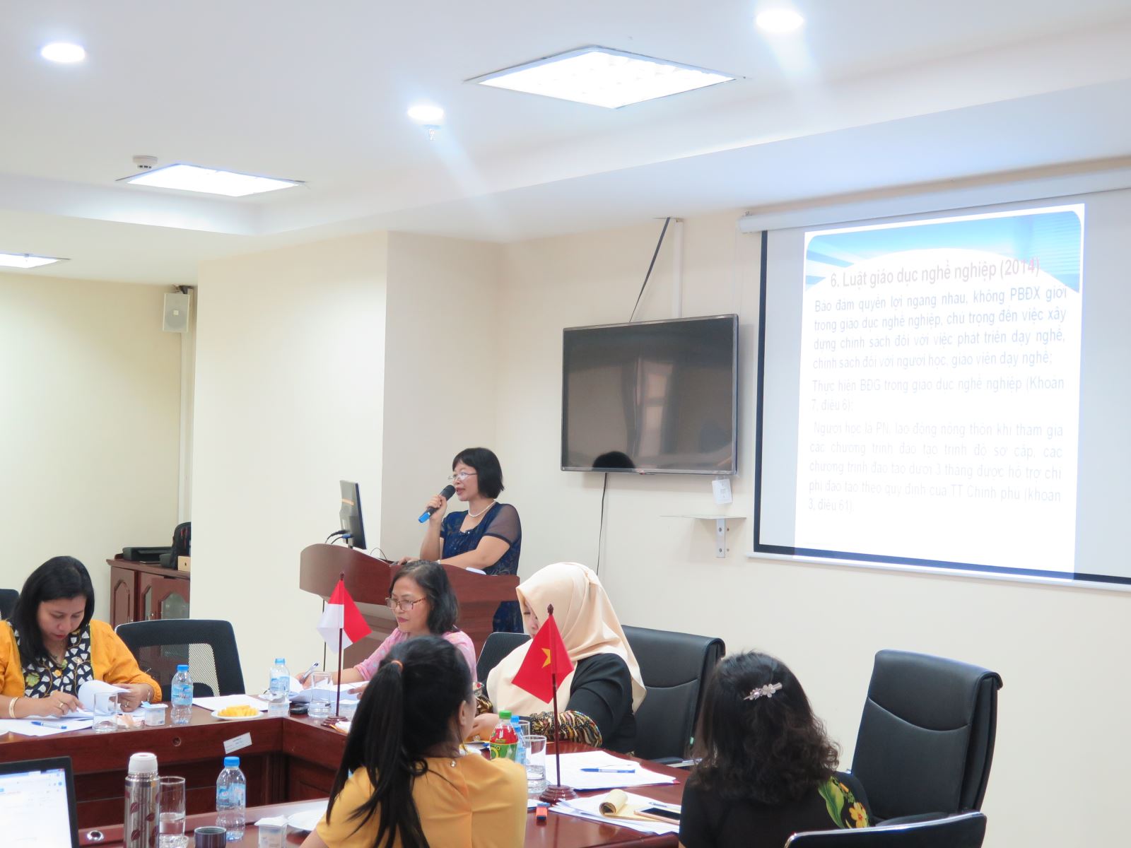 Tại hội thảo, TS. Dương kim Anh đã giới thiệu một số nội dung luật pháp, chính sách của Việt Nam về Phụ nữ trong Giáo dục (Vị trí, vai trò của Giáo dục ở Việt Nam; Quan điểm giáo dục trong Luật pháp, Chính sách Việt Nam; Một số vấn đề liên quan đến phụ nữ & giới trong giáo dục ở Việt Nam; Chiến lược và chương trình quốc gia về bình đẳng giới giai đoạn 2011 – 20115; Luật Giáo dục; Luật Giáo dục đại học…).