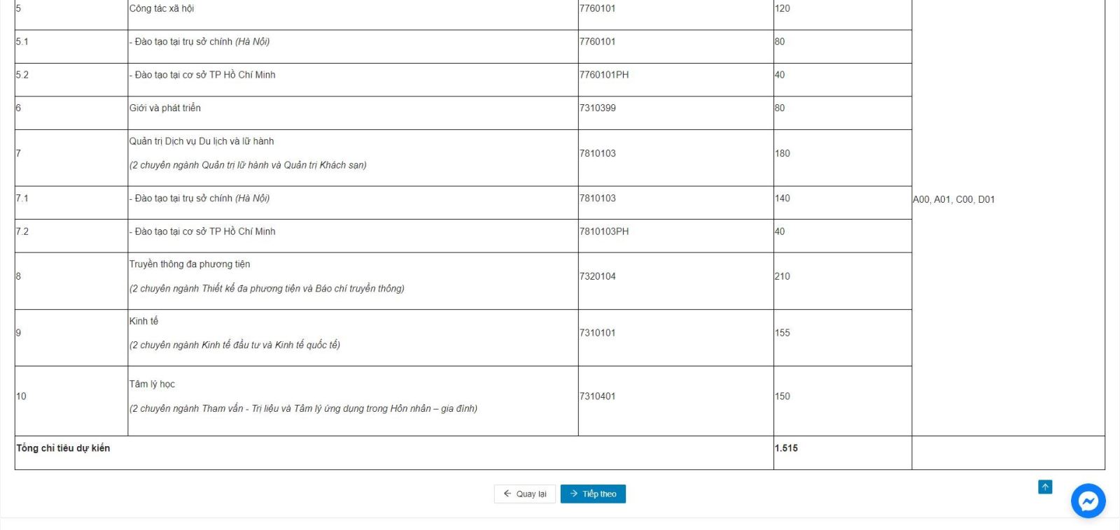 Bước 7: Tại cửa sổ này sẽ hiển thị Phương thức xét tuyển, Danh sách Tổ hợp đăng ký xét tuyển, Ngưỡng bảo bảm chất lượng, Chỉ tiêu tuyển sinh Đại học chính quy năm 2023 để Thí sinh tham khảo. Sau đó Thí sinh nhấn Tiếp theo để chuyển tiếp sang cửa sổ tiếp.