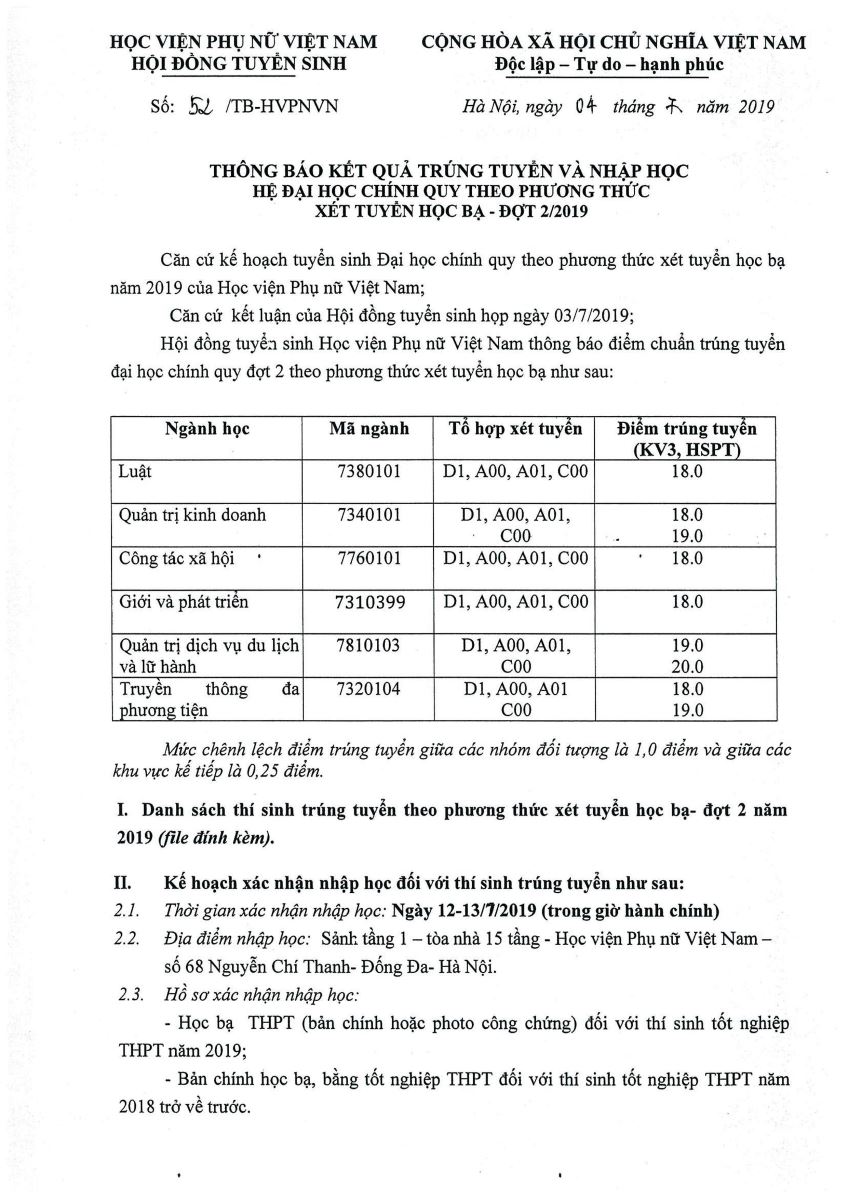 Tin tứcKẾT QUẢ TRÚNG TUYỂN VÀ NHẬP HỌC ĐH CHÍNH QUY 2019 (ĐỢT 2) Posted on Tháng Bảy 4, 2019 by admin(full) 04 Th7 DANH SÁCH TRÚNG TUYỂN ĐẠI HỌC THEO PHƯƠNG THỨC XÉT HỌC BẠ (ĐỢT 2) admin(full) Học viện Phụ nữ Việt Nam tham gia phối hợp coi thi kỳ thi THPT Quốc gia năm 2019 tại tỉnh Hòa Bình Quyết định tốt nghiệp năm 2019