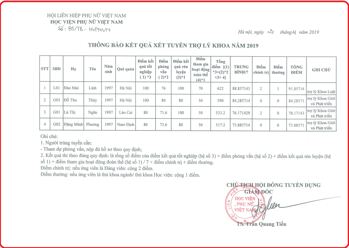 Kết quả xét tuyển trợ lý Khoa Luật; Giới & phát triển