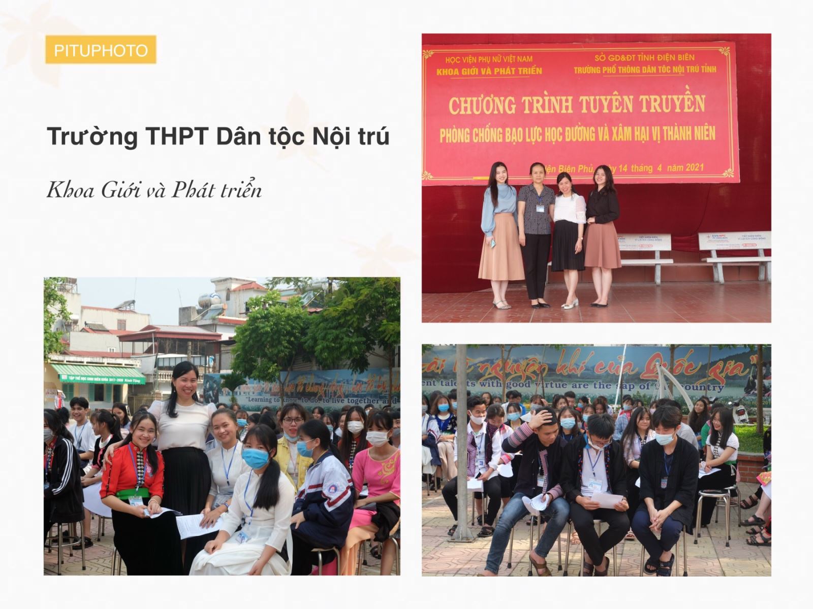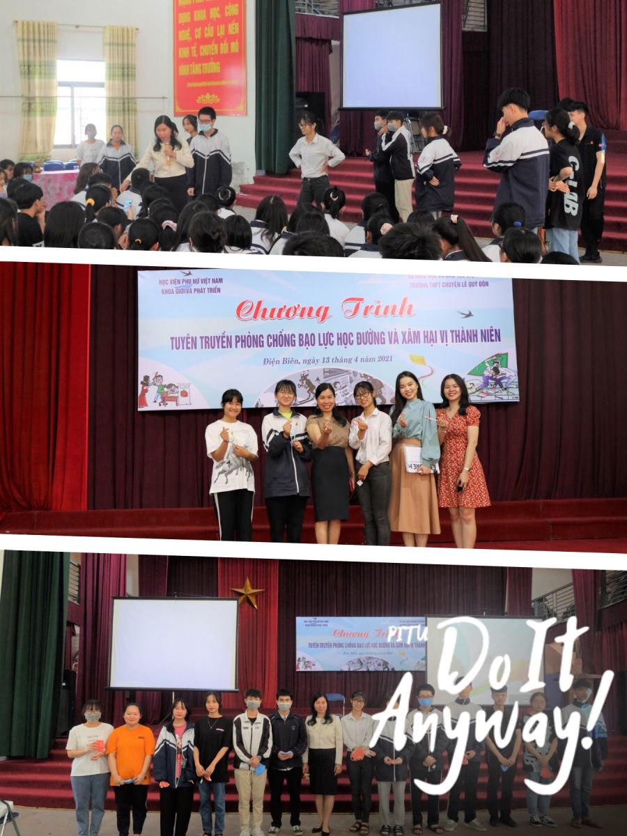 Khoa Giới và phát triển đã phối hợp với Sở Giáo dục và đào tạo, Hội LHPN các tỉnh Điện Biên, Hà Giang, Yên Bái, Vĩnh Phúc, Hà Nội và trực tiếp liên hệ với Ban giám hiệu của 15 trường trên địa bàn các tỉnh để bố trí lịch tuyên truyền cho toàn thể học sinh các trường. Kết quả là hơn 10.800 học sinh khối PTTH các tỉnh (Điện Biên: 7000 học sinh, Yên Bái: 1050 học sinh, Vĩnh Phúc: 1400 học sinh, Hà Giang: 600 học sinh; Hà Nội: 750 học sinh) được lĩnh hội các kiến thức và kỹ năng phòng chống bạo lực, quấy rối, xâm hại trẻ em, đặc biệt là xâm hại tình dục thanh thiếu niên thông qua cách truyền thông trực quan với những tình huống xử lý cụ thể khi gặp nguy hiểm bởi hành vi bạo lực, xâm hại. Điều đó đã giúp cho các em học sinh nâng cao nhận thức, từ đó áp dụng vào cuộc sống, góp phần bảo vệ bản thân và các bạn cùng trang lứa.