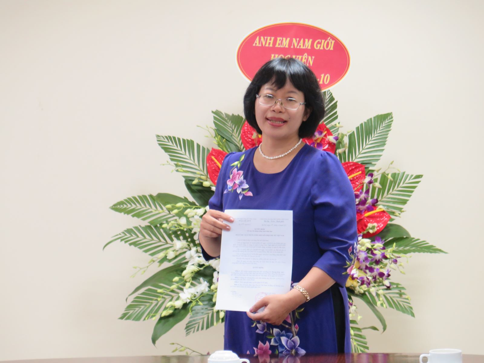 TS Dương Kim Anh đã phát biểu nhận nhiệm vụ và mong muốn tiếp tục nhận được sự quan tâm, giúp đỡ của lãnh đạo Hội Liên hiệp Phụ nữ Việt Nam, Ban Giám đốc và cán bộ viên chức, sinh viên Học viện; cam kết sẽ đem hết năng lực, trí tuệ, sự nhiệt huyết để cùng tập thể lãnh đạo xây dựng, phát triển Học viện.