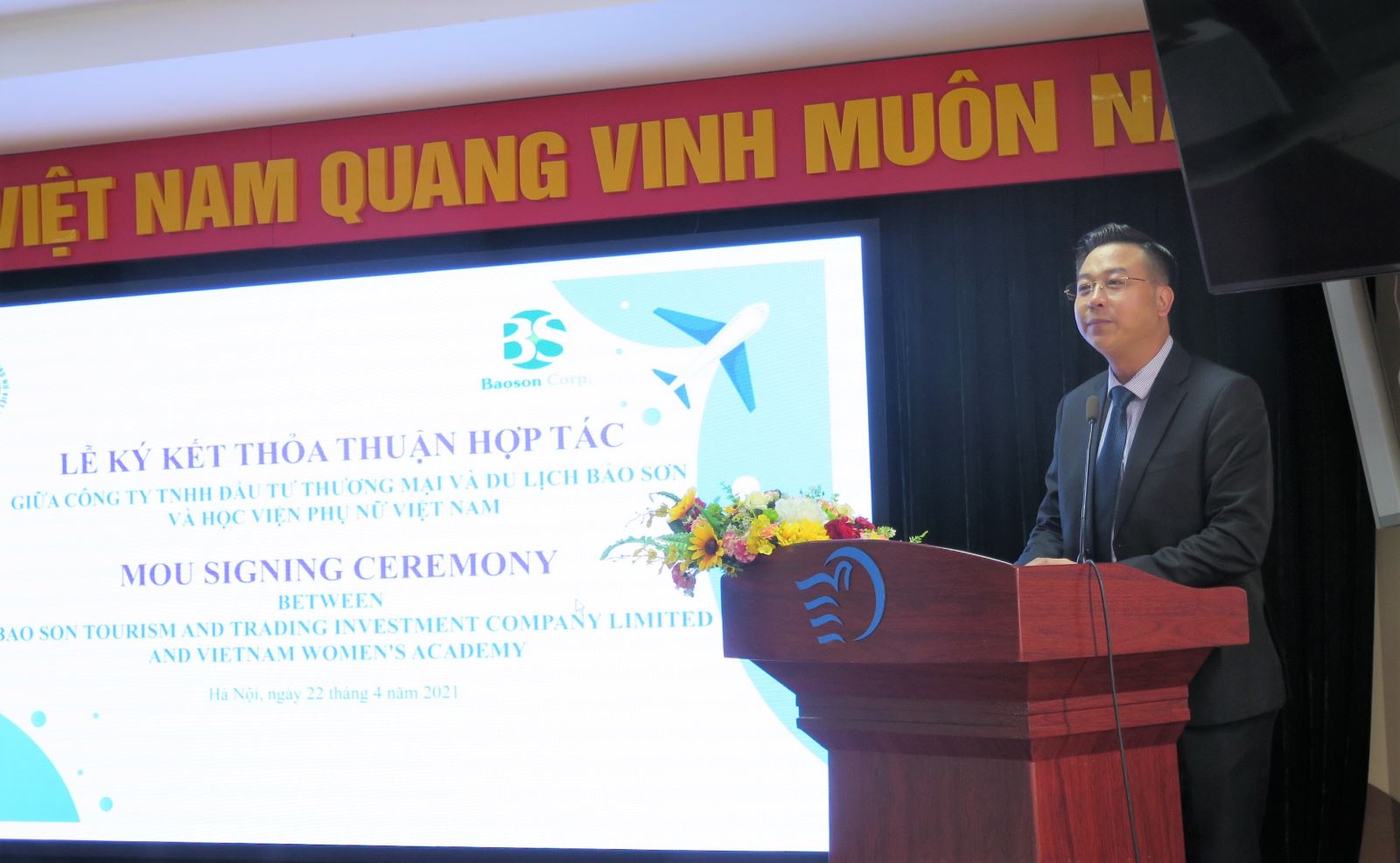 Phát biểu khai mạc lễ ký kết, PGS.TS Trần Quang Tiến khẳng định, đứng trước sự thay đổi nhanh chóng của nhu cầu thị trường lao động các trường đại học nói chung và Học viện Phụ nữ Việt Nam nói riêng đã có những thay đổi từ nội dung, phương pháp, hình thức đào tạo đến các thức quản trị đại học. Với mục tiêu giáo dục toàn diện, chất lượng, bình đẳng, Học viện Phụ nữ Việt Nam đã ký kết trên 50 biên bản ghi nhớ hợp tác với các đơn vị, tổ chức doanh nghiệp trong và ngoài nước đồng thời không ngừng vận động nhằm thay đổi phương pháp dạy học hướng đến việc đào tạo sinh viên đáp ứng nguồn nhân lực chất lượng cao, phù hợp với nhu cầu xã hội. Ngoài ra, mục tiêu thương mại hóa, ứng dụng kết quả nghiên cứu khoa học ra phạm vi bên ngoài học viện cũng là một điểm nhấn trong mô hình kết nối trường đại học và doanh nghiệp. Đặc biệt, trong mối quan hệ hai chiều, dựa trên nền tảng nghiên cứu, giảng dạy, thực hành, Học viện Phụ nữ Việt Nam hi vọng sẽ tham gia tư vấn chiến lược, tư vấn quản lý, xây dựng chính sách,… để thúc đẩy sự phát triển của doanh nghiệp đối tác và nâng cao hiệu quả hợp tác giữa hai bên. Lễ ký kết hôm này là khởi đầu cho chuỗi các hoạt động phối hợp toàn diện từ: đào tạo, trao đổi sinh viên, thực tập, việc làm cho đến hỗ trợ sinh viên kỹ năng mềm, du học…giữa Học viện Phụ nữ Việt Nam và Tập đoàn Bảo Sơn.