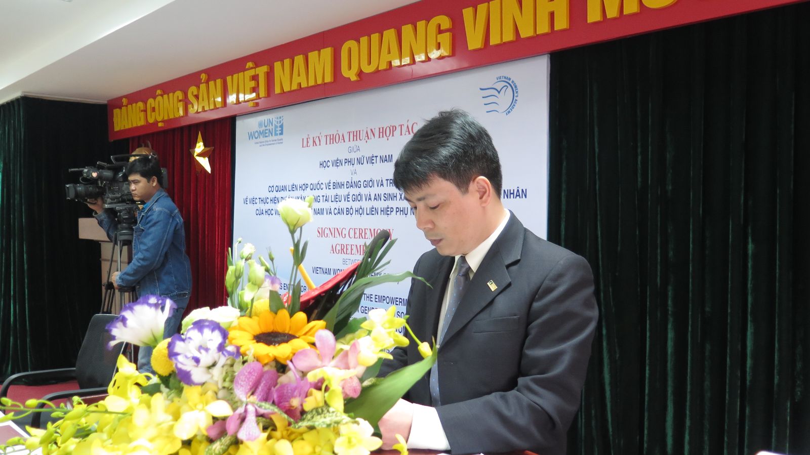 Phát biểu tại lễ ký kết, Giám đốc Trần Quang Tiến bày tỏ sự vui mừng phấn khởi trước sự tham gia của đại diện UN Women, sự chứng kiến của Phó Chủ tịch thường trực Hoàng Thị Ái Nhiên và các vị khách mời trong sự kiện đặc biệt này.