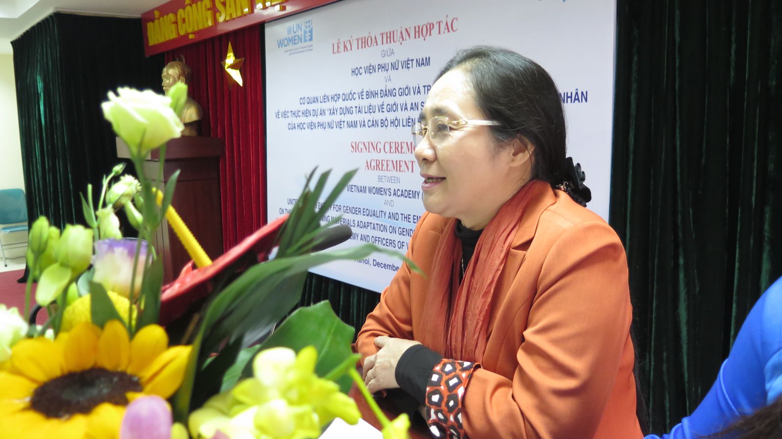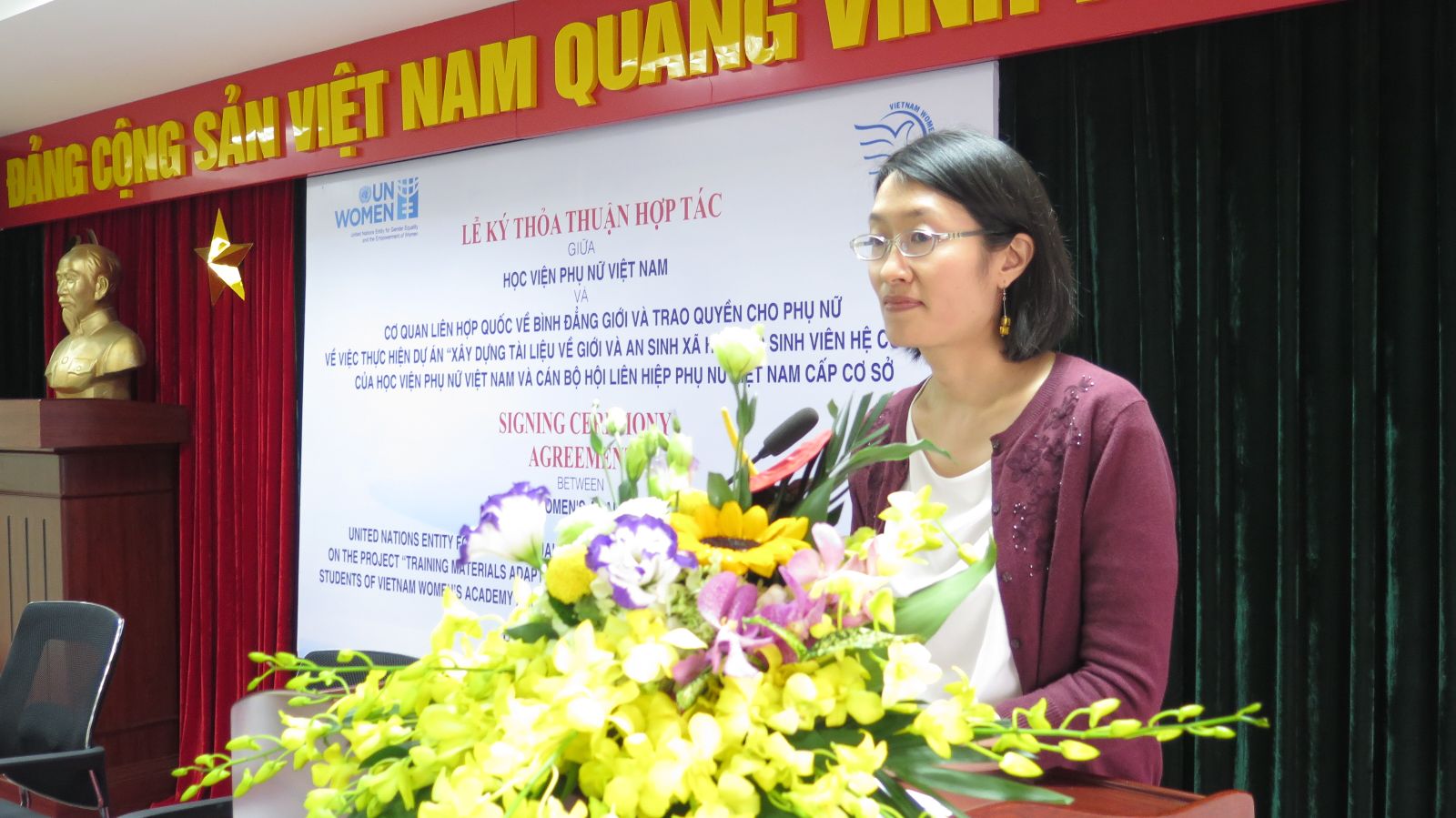 Đại diện Hội LHPN Việt Nam, Phó Chủ tịch Hoàng Thị Ái Nhiên chúc mừng Học viện và UN Women sau quá trình làm việc đã đi đến thỏa thuận ký kết hôm nay. Bà cũng chia sẻ về sự khó khăn, lo lắng của Hội LHPN Việt Nam khi giao cho Học viện đào tạo chuyên ngành Giới và Phát triển hệ cử nhân. Hiện nay, Học viện Phụ nữ Việt Nam là trường duy nhất đào tạo chuyên ngành này. Với sự hỗ trợ của UN Women, sự phối hợp của các cơ quan, tổ chức khác bà tin tưởng rằng sự kiện này sẽ là khởi đầu tốt đẹp cho hành trình hợp tác bền chặt, hiệu quả giữa UN Women đối với Hội LHPN Việt Nam nói chung và Học viện Phụ nữ Việt Nam nói riêng vì mục tiêu chung là sự bình đẳng, tiến bộ của phụ nữ.