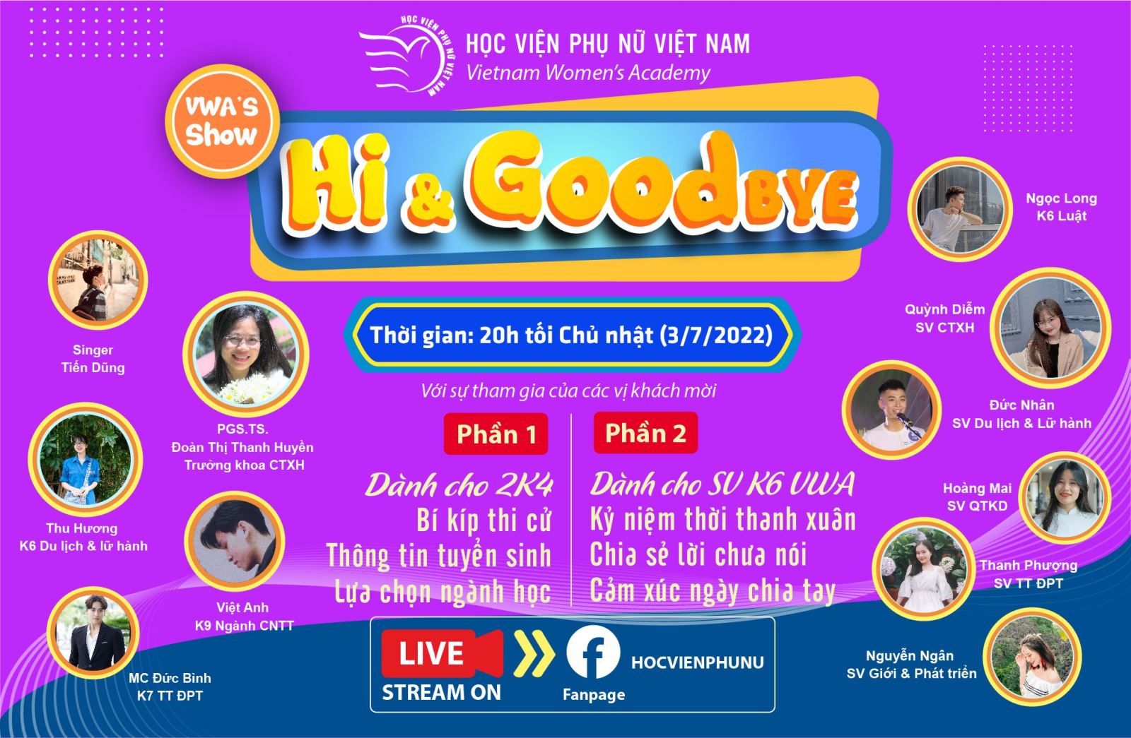 Mời các bạn cùng theo dõi Livestream HI & GOODBYE! trên Fanpage: Học viện Phụ nữ Việt Nam vào 20h tối Chủ nhật, ngày 3/7/2022.