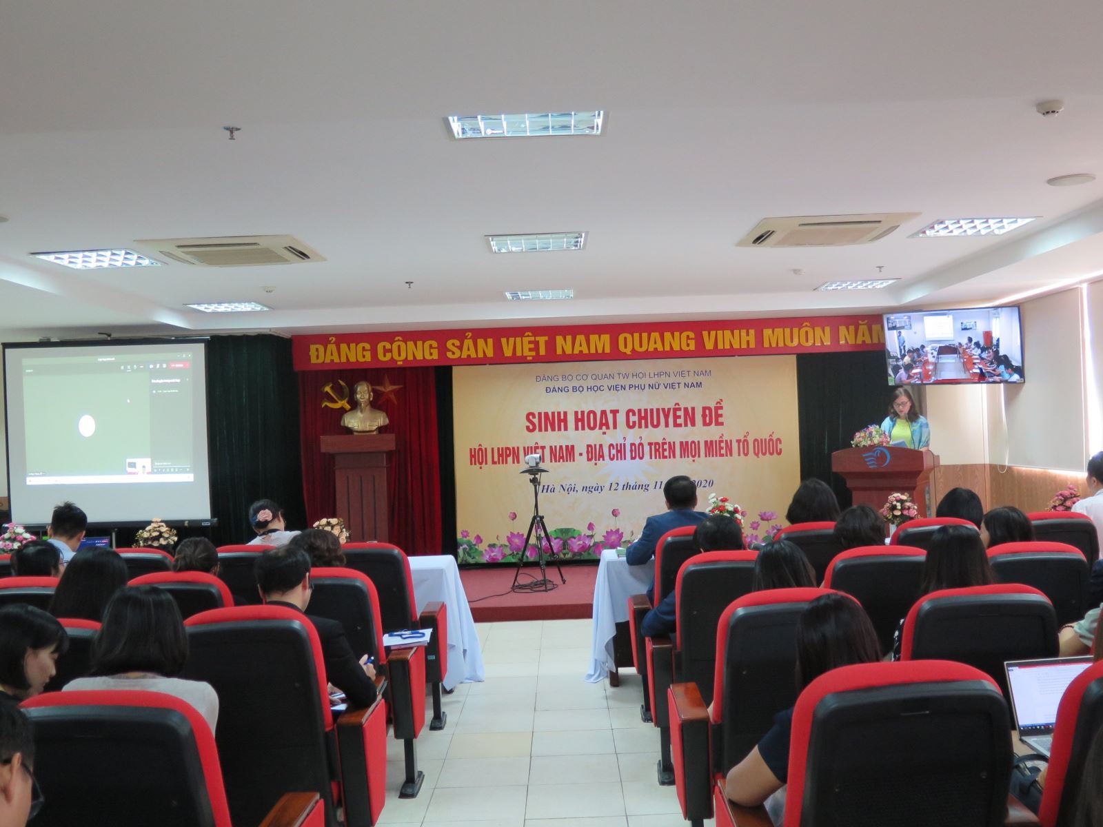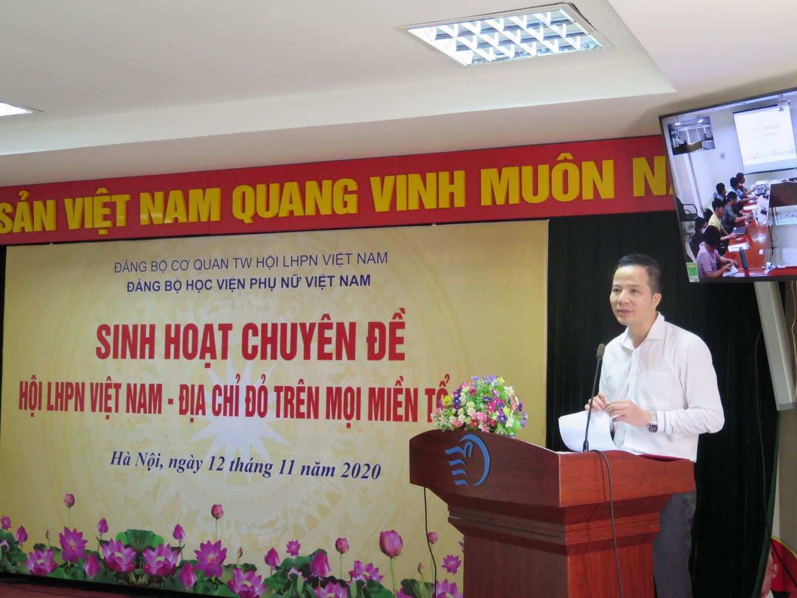 Đồng chí Nguyễn Phi Long – Phó Bí thư Đảng bộ Học viện Phụ nữ Việt Nam khái quát nội dung tuyên truyền, nâng cao nhận thức và hiểu biết của cán bộ đảng viên, quần chúng về các khu di tích lịch sử – nơi ra đời, phát triển và trưởng thành của Hội Liên hiệp Phụ nữ Việt Nam