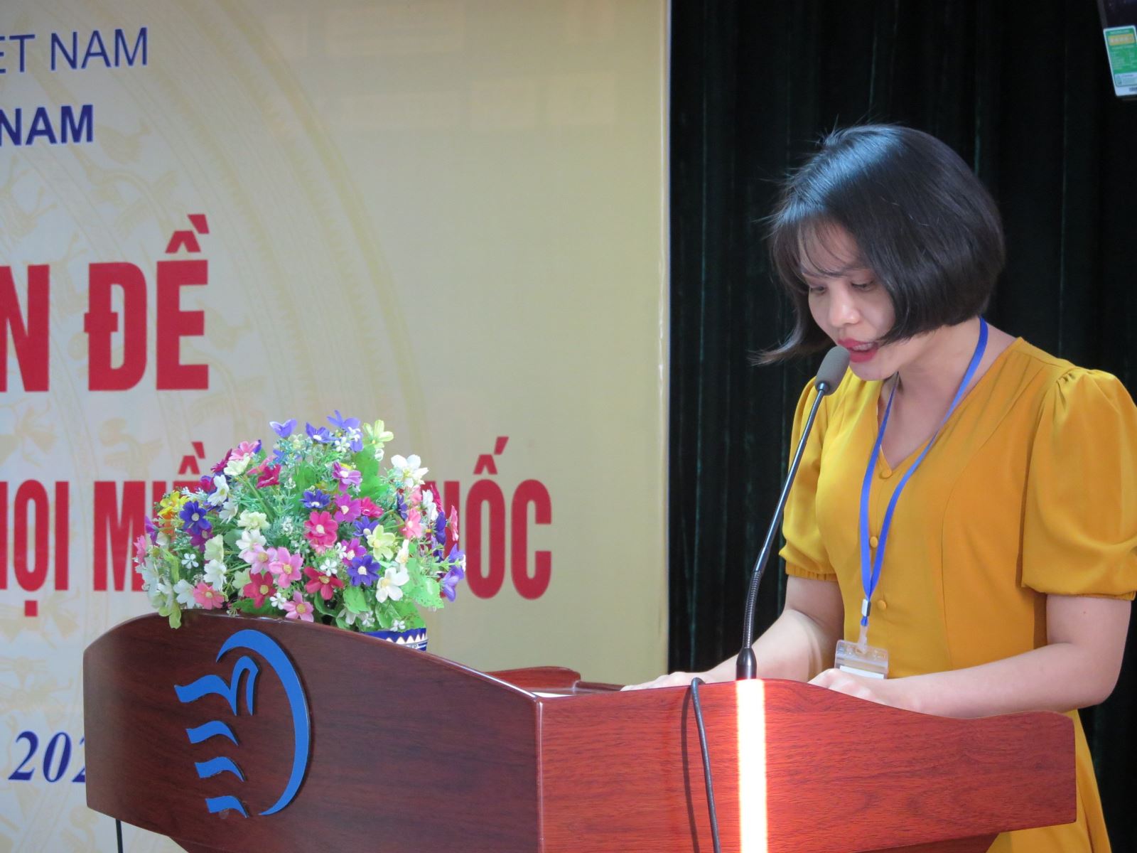 Đồng chí Nguyễn Thị Thu Hương – Bí thư Chi bộ 5 Phân hiệu Học viện Phụ nữ Việt Nam tại TP. Hồ Chí Minh trình bày tham luận: Căn cứ Trung ương Cục miền Nam – nơi Hội Liên hiệp Phụ nữ Giải phóng miền Nam ra đời