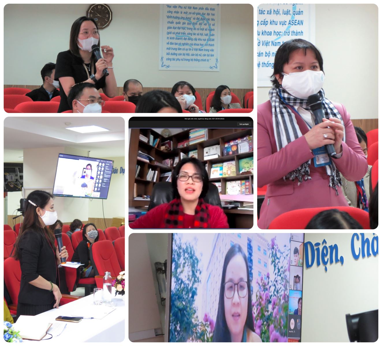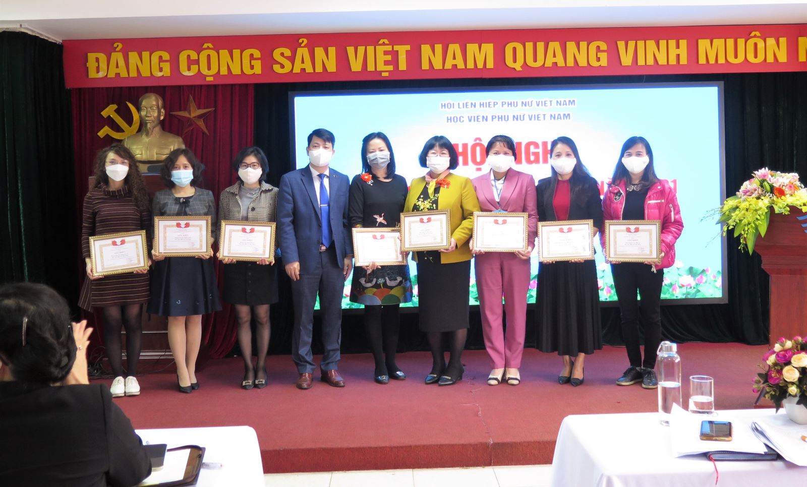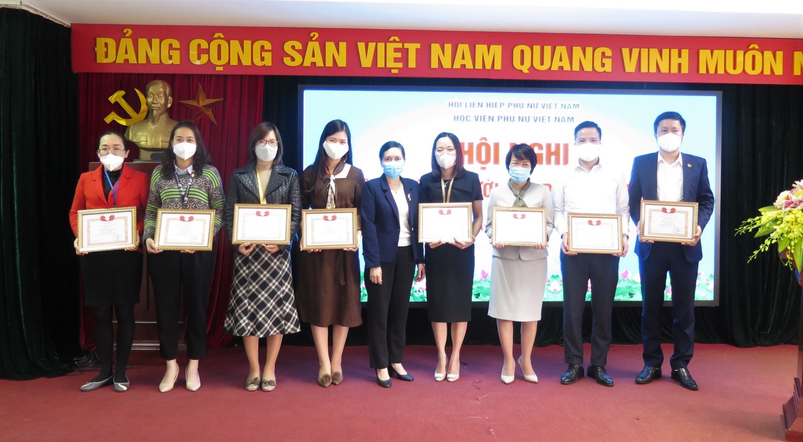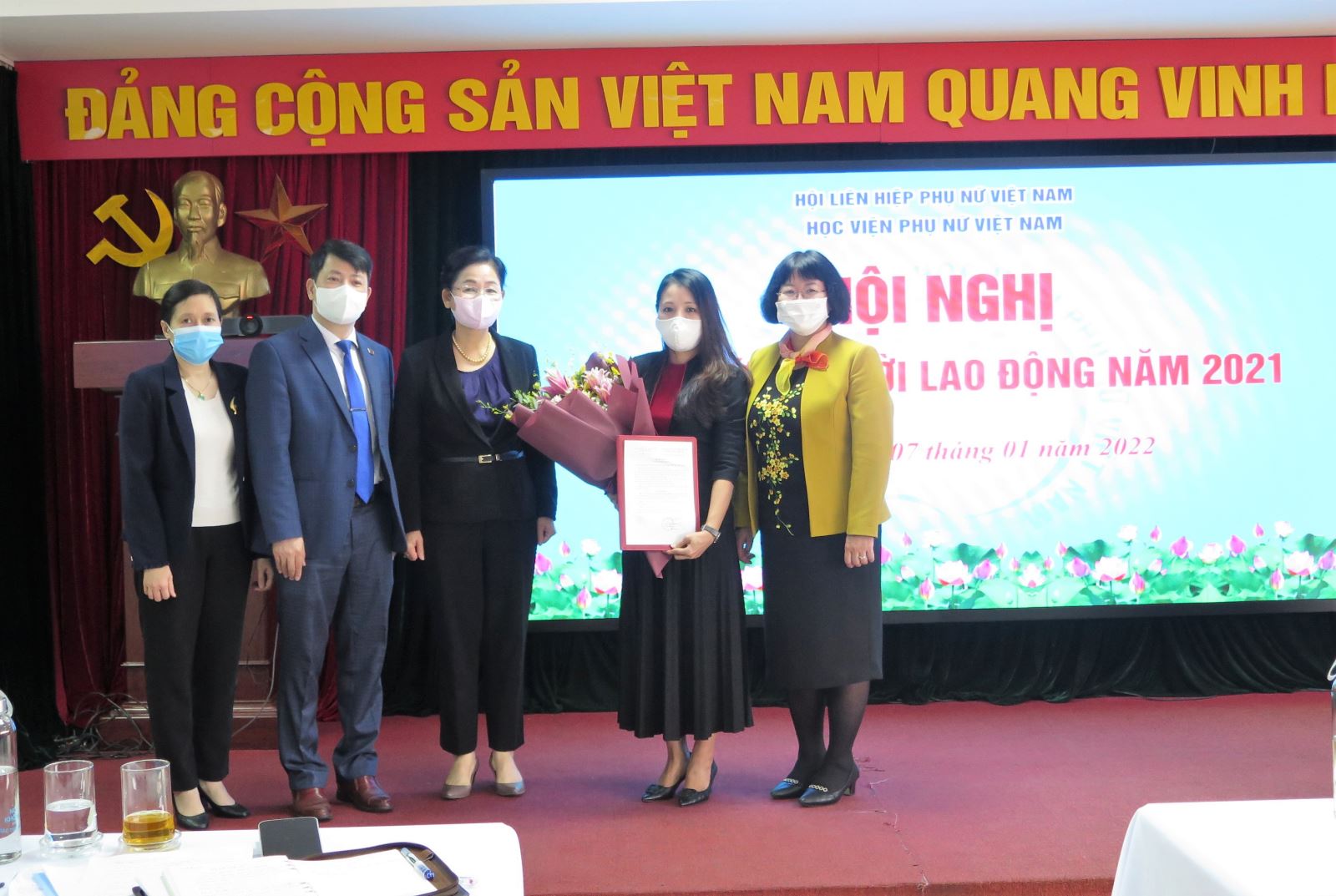 Phó Chủ tịch Trần Thị Hương và Ban Giám đốc Học viện chúc mừng đ/c Nguyễn Thu Hương nhận QĐ bổ nhiệm PGĐ Học viện phụ trách Phân hiệu HVPNVN