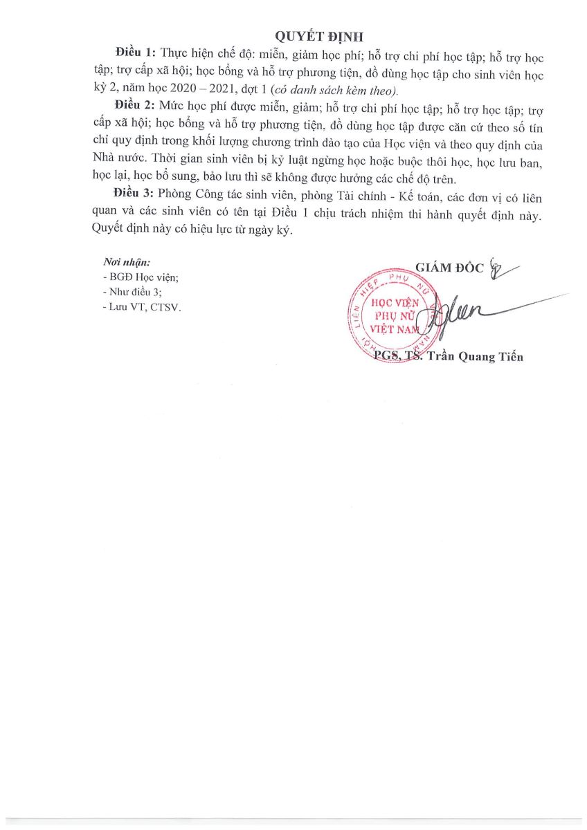 Quyết định về việc sinh viên được hưởng chế độ chính sách HK2, 2020 – 2021