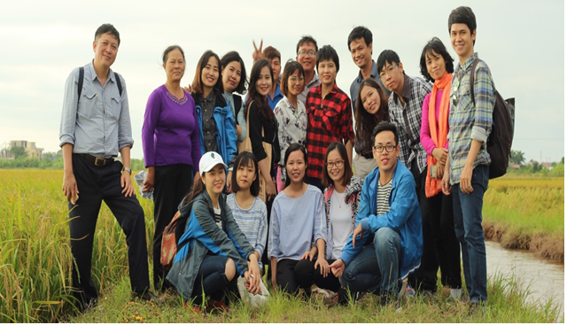 Sinh viên ngành Giới và phát triển chụp ảnh cùng lớp tập huấn bên mô hình “Ruộng lúa bờ hoa” (Ảnh: Ngọc Linh Oxfam)