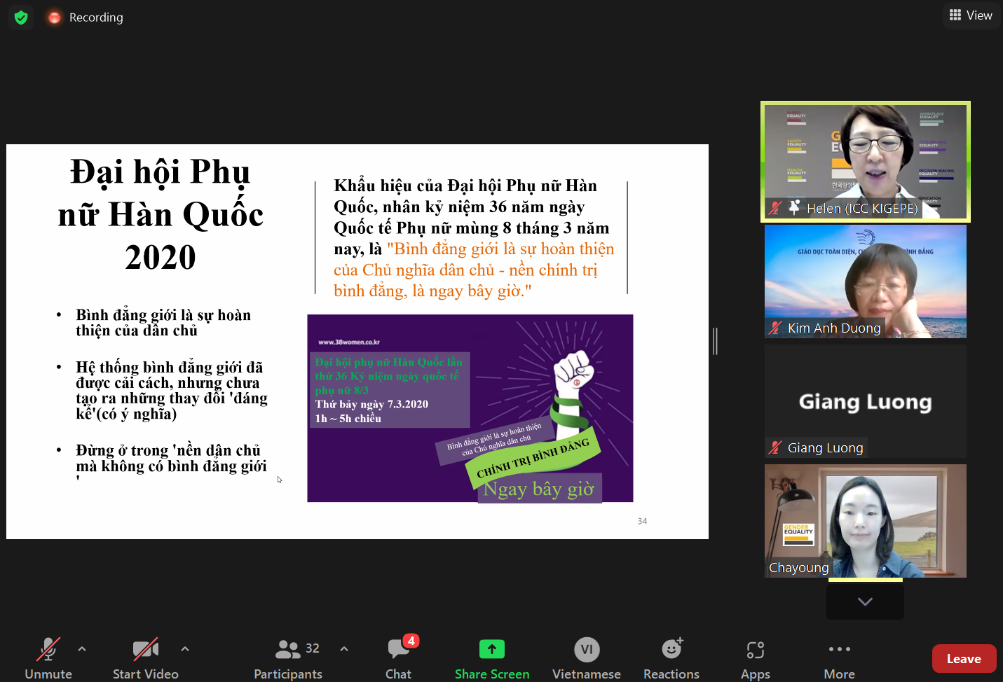 Bài chia sẻ cuối cùng về “Tìm hiểu các quy tắc và chuẩn mực quốc tế, đặc biệt chú trọng đến Công ước CEDAW vì sự tiến bộ của bình đẳng giới” được bà Jang Eunha, Giám đốc, Viện Phát triển Phụ nữ Hàn Quốc. Bà Jang đã chia sẻ về lịch sử phát triển chương trình nghị sự về giới ở Liên hợp quốc, đặc biệt tập trung vào Công ước về xóa bỏ phân biệt đối xử với phụ nữ; xây dựng Chương trình nghị sự của Phụ nữ tại Liên hợp quốc; và Công ước về xóa bỏ phân biệt đối xử với phụ nữ (CEDAW).