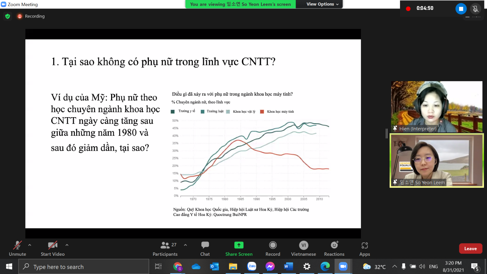 Buổi chiều cùng ngày, bà Lim Soyeon, Giáo sư, Đại học nữ Sookmyung đã trình bày về các khoảng cách giới trong kỹ thuật số; vấn đề công nghệ thông tin truyền thông và trao quyền cho phụ nữ: vấn đề quá ít/nhiều phụ nữ trong lĩnh vực công nghệ thông tin hay vấn đề phụ nữ có sợ công nghệ hay không. Bà Lim đã đặt ra các câu hỏi thảo luận về yếu tố ảnh hưởng đến khoảng cách giới tới kỹ thuật số, thảo luận sâu về nhiều vấn đề xoay quanh khoảng cách giới trong STEM nói riêng và công nghệ thông tin và truyền thông nói chung…