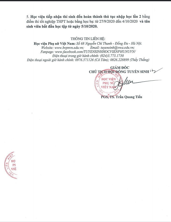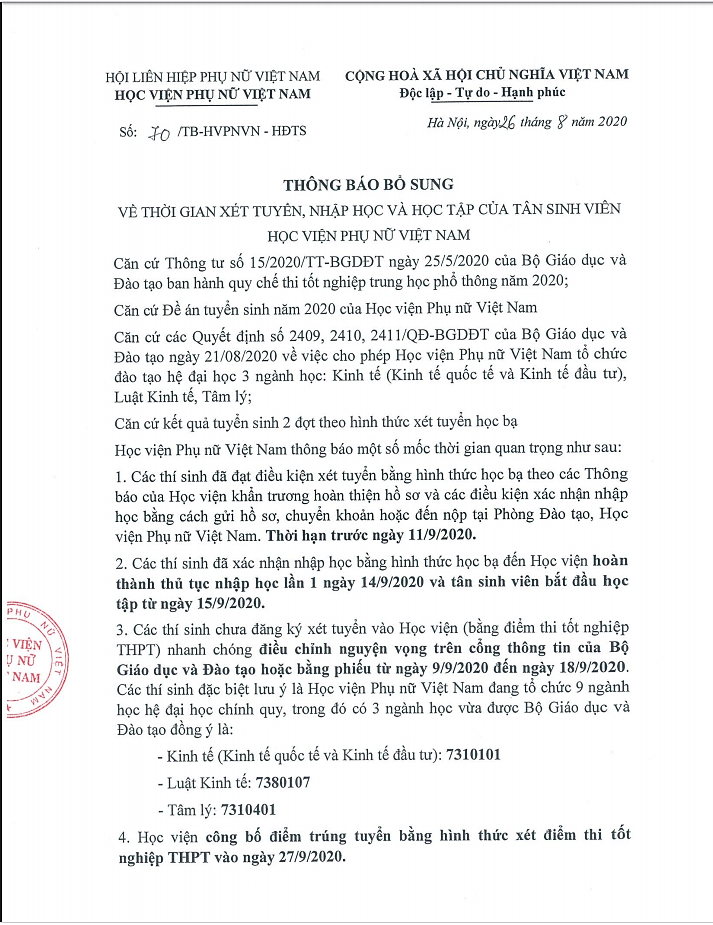 Tin tứcTHÔNG BÁO BỔ SUNG VỀ TUYỂN SINH ĐẠI HỌC 2020 Posted on Tháng Tám 26, 2020 by admin(full) 26 Th8 admin(full) Những điều cần biết về Học viện Phụ nữ Việt NamHọc viện Phụ nữ Việt Nam xét tuyển 870 chỉ tiêu đại học