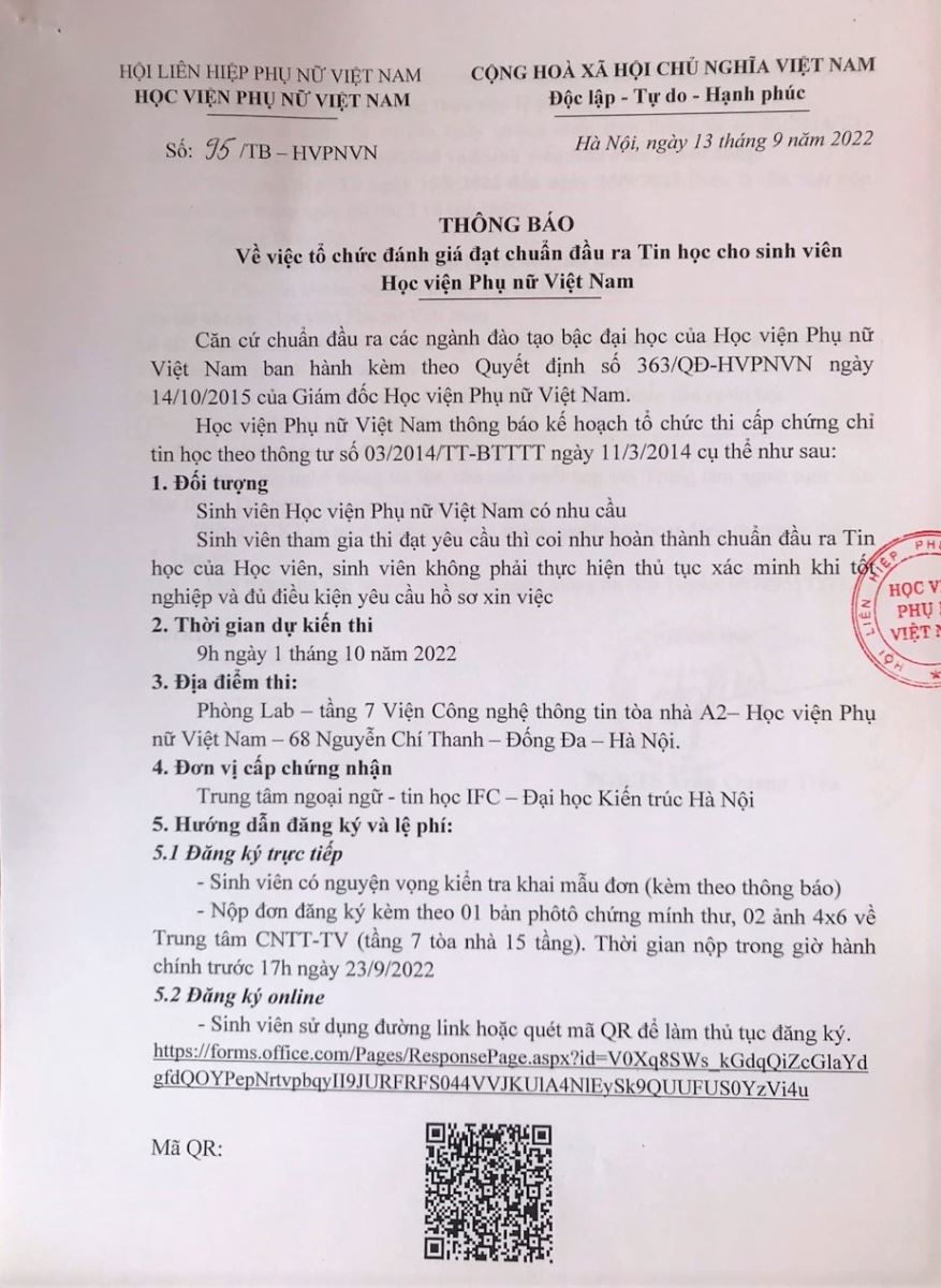 Tin tứcThông báo đánh giá đạt chuẩn đầu ra Tin học cho sinh viên Posted on Tháng Chín 14, 2022 by admin(full) 14 Th9 Sinh viên có nhu cầu dự thi mời đăng ký TẠI ĐÂY Quét mã QR admin(full) Quyết định kiện toàn cố vấn học tập sinh viên năm học 2022 – 2023Giám đốc Học viện Phụ nữ Việt Nam dự báo điểm trúng tuyển