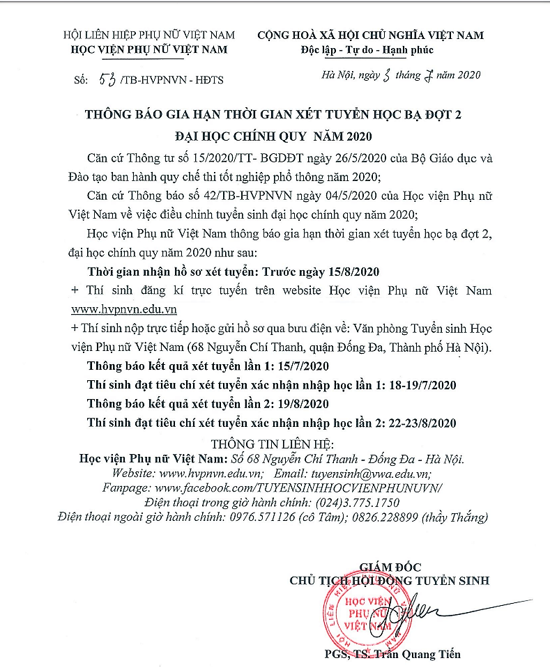 Tin tứcTHÔNG BÁO GIA HẠN THỜI GIAN XÉT HỌC BẠ ĐỢT 2 Posted on Tháng Bảy 3, 2020 by admin(full) 03 Th7 LINK ĐĂNG KÝ XÉT TUYỂN TRỰC TUYẾN PHIẾU ĐĂNG KÝ XÉT TUYỂN PHIẾU ĐĂNG KÝ XÉT TUYỂN THẲNG admin(full) Ký túc xá khang trang, hiện đại phục vụ học tập, sinh hoạt của sinh viên Học viện Phụ nữ Việt Nam Phát biểu khai mạc hội thảo KHQT: “Vai trò Giới trong gia đình hiện đại”