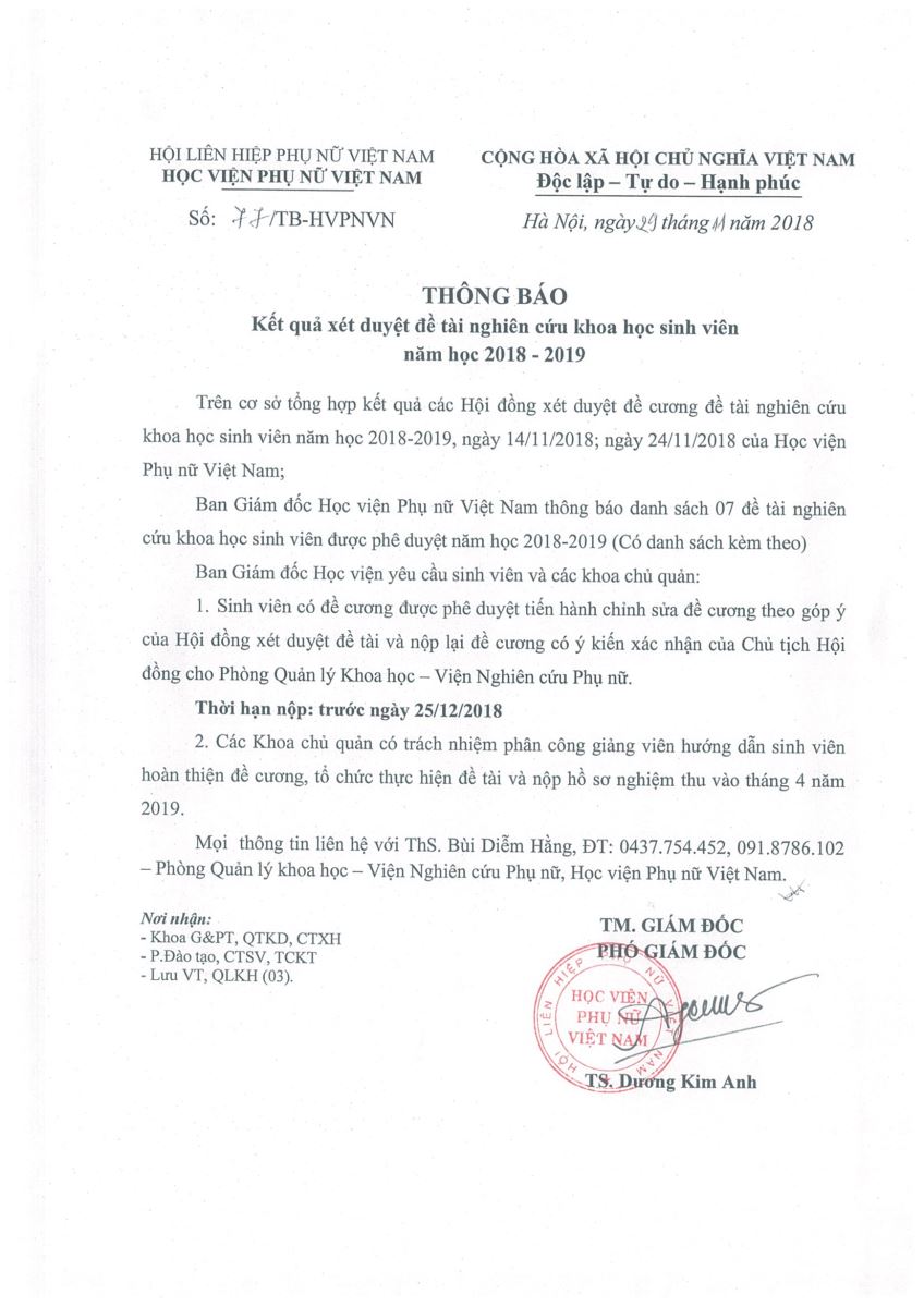 Thông báo kết quả xét duyệt đề tài NCKH của sinh viên năm học 2018 - 2019
