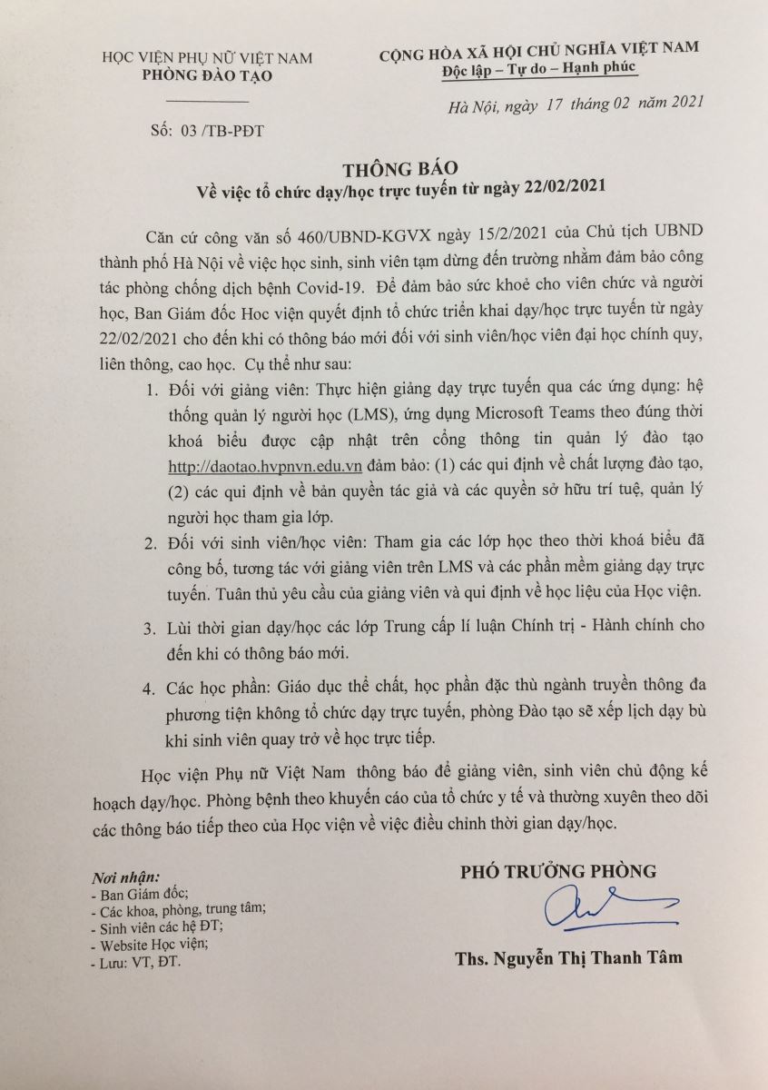 Tin tứcThông báo tổ chức dạy/học trực tuyến từ ngày 22/02/2021 Posted on Tháng Hai 18, 2021 by admin(full) 18 Th2 admin(full) Lễ bàn giao trang thiết bị của Viện FES Việt Nam dành cho Học viện Phụ nữ Việt Nam Tập huấn giảng dạy trên hệ thống quản lý học trực tuyến LMS