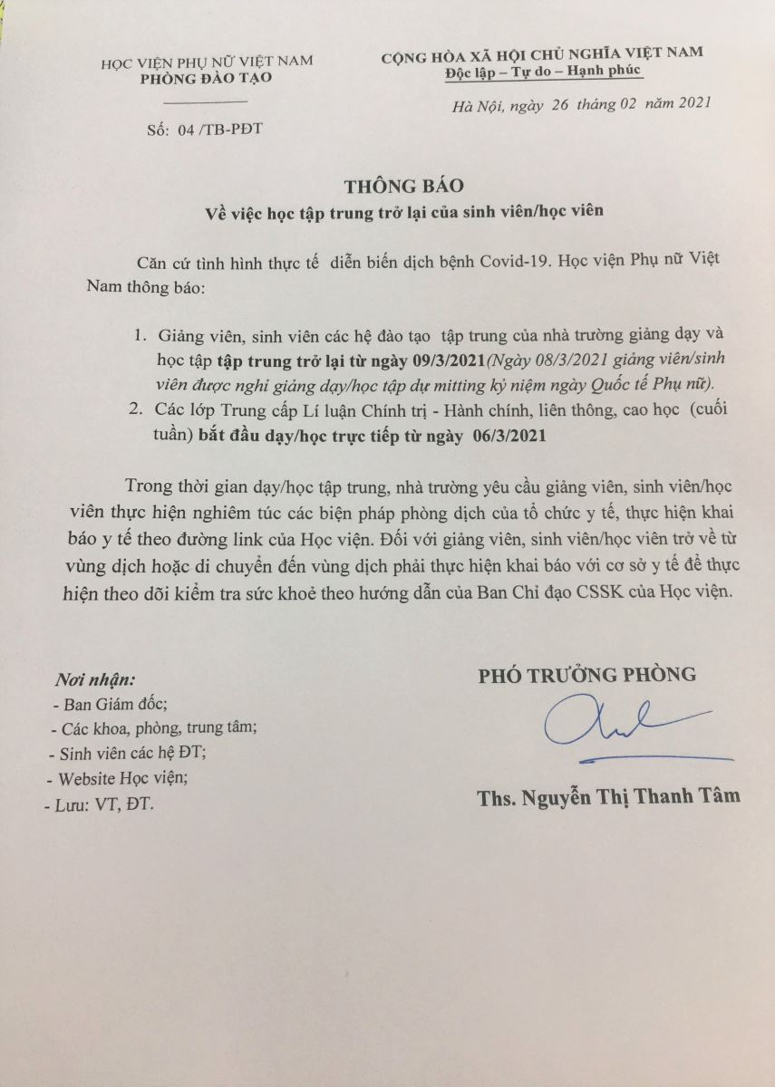 Tin tứcThông báo về việc học tập trung trở lại của sinh viên/học viên Posted on Tháng Hai 25, 2021 by admin(full) 25 Th2 admin(full) Tập huấn giảng dạy trên hệ thống quản lý học trực tuyến LMS Học viện Phụ nữ Việt Nam tăng chỉ tiêu tuyển sinh năm 2021