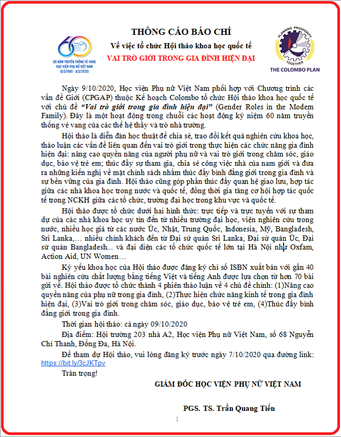 Thông cáo báo chí Hội thảo KH Quốc tế “Vai trò giới trong gia đình hiện đại”