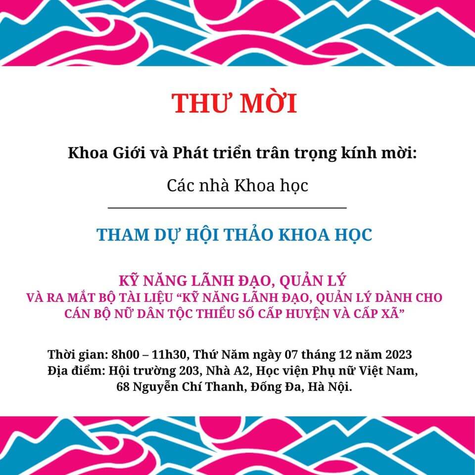 Thực hiện kế hoạch chuyên môn của Học viện Phụ nữ Việt Nam và căn cứ kế hoạch Xây dựng tài liệu Kỹ năng lãnh đạo, quản lý dành cho cán bộ nữ DTTS năm 2023, Khoa Giới và Phát triển tổ chức Hội thảo khoa học Kỹ năng lãnh đạo, quản lý và ra mắt bộ tài liệu “Kỹ năng lãnh đạo, quản lý dành cho cán bộ nữ DTTS cấp huyện và cấp xã”.