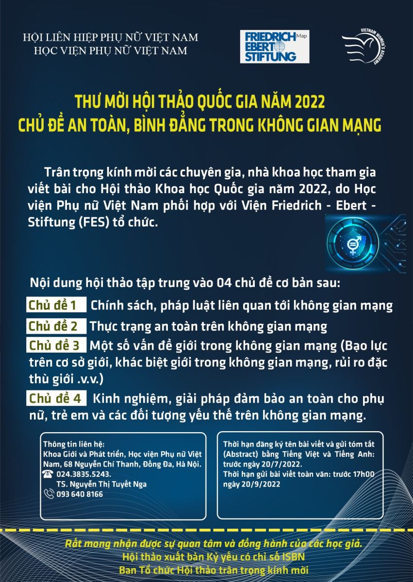 Trong bối cảnh Cách mạng công nghiệp 4.0 ngày càng phát triển mạnh mẽ, cùng những thách thức do đại dịch Covid 19 mang lại cho thấy việc thúc đẩy giáo dục trong môi trường số là yêu cầu cấp thiết. Học viện Phụ nữ Việt Nam phối hợp với Viện Friedrich-Ebert- Stiftung (FES) tổ chức Hội thảo khoa học “An toàn, bình đẳng trong không gian mạng” nhằm tạo diễn đàn học thuật, chia sẻ kiến thức giữa giảng viên, sinh viên và chuyên gia ngành Giới & Phát triển, chuyên gia Công nghệ thông tin, các nhà khoa học trong lĩnh vực liên quan về nội dung lý luận và thực tiễn giải quyết các vấn đề giới gắn với an toàn trên không gian mạng.
